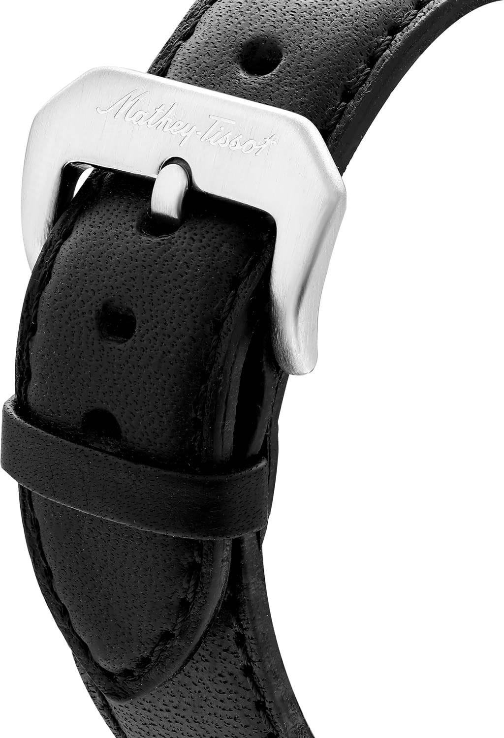 Мужские кварцевые часы Mathey-Tissot Mergulhador GMTGMTОтображение времени второго часового пояса.Такая функция особенно актуальна для путешественников и бизнесменов,которые общаются с людьми из разных стран,теперь вы всегда будете знать,какой час у вашего партнёра или близкого человека. MRGSK — это стильное сочетание элегантности и современного дизайна. Изящный корпус выполнен из нержавеющей стали, диаметром 41 мм, что придаст образу элегантности и надежности. Циферблат с метками в виде штрихов придает модели особый блеск. Циферблат защищен минеральным стекломМинеральное стеклоМинеральное стекло представляет собой искусственно выращенный минерал кварца. Такое стекло отличается особой устойчивостью к повреждениям и царапинам. Уступает по некоторым качествам сапфировому стеклу. с сапфировым покрытием, обеспечивает устойчивость к царапинам. Второй часовой поясВторой часовой поясФункция, позволяющая отображать время двух часовых поясов одновременно. в 24-х часовом формате времени отображается центральной стрелкой. Стрелки и метки с люминесцентным покрытиемЛюминесцентное покрытиеПозволяет считывать показания времени в темноте. Производители наносят на стрелки, часовые индексы, безель или поверхность циферблата светонакопительный состав, дающий холодное свечение. SuperLumiNova, которое светится в темноте после непродолжительной зарядки на свету. Окошко даты находится в положении 6 часов.  Рифленый безельБезельВнешний ободок, закрепляющий стекло. В спортивных часах так называется поворотное кольцо с делениями на циферблате, выполняет роль таймера – замеряет отрезки времени на шкале. Неподвижный безель – элемент декора. Однонаправленно вращающийся безель на дайверских часах позволяет фиксировать моменты погружения и выныривания на поверхность. с минутными отметками вращается в одном направлении. Часы оснащены надежным кварцевым механизмом. Кожаный ремешок на стандартной застёжке гарантирует комфортное и безопасное ношение. Класс водозащиты: 200 метров позволит плавать, нырять и заниматься другими водными видами спорта. Mathey-Tissot  — отличный выбор для тех, кто ценит утонченность и качество.