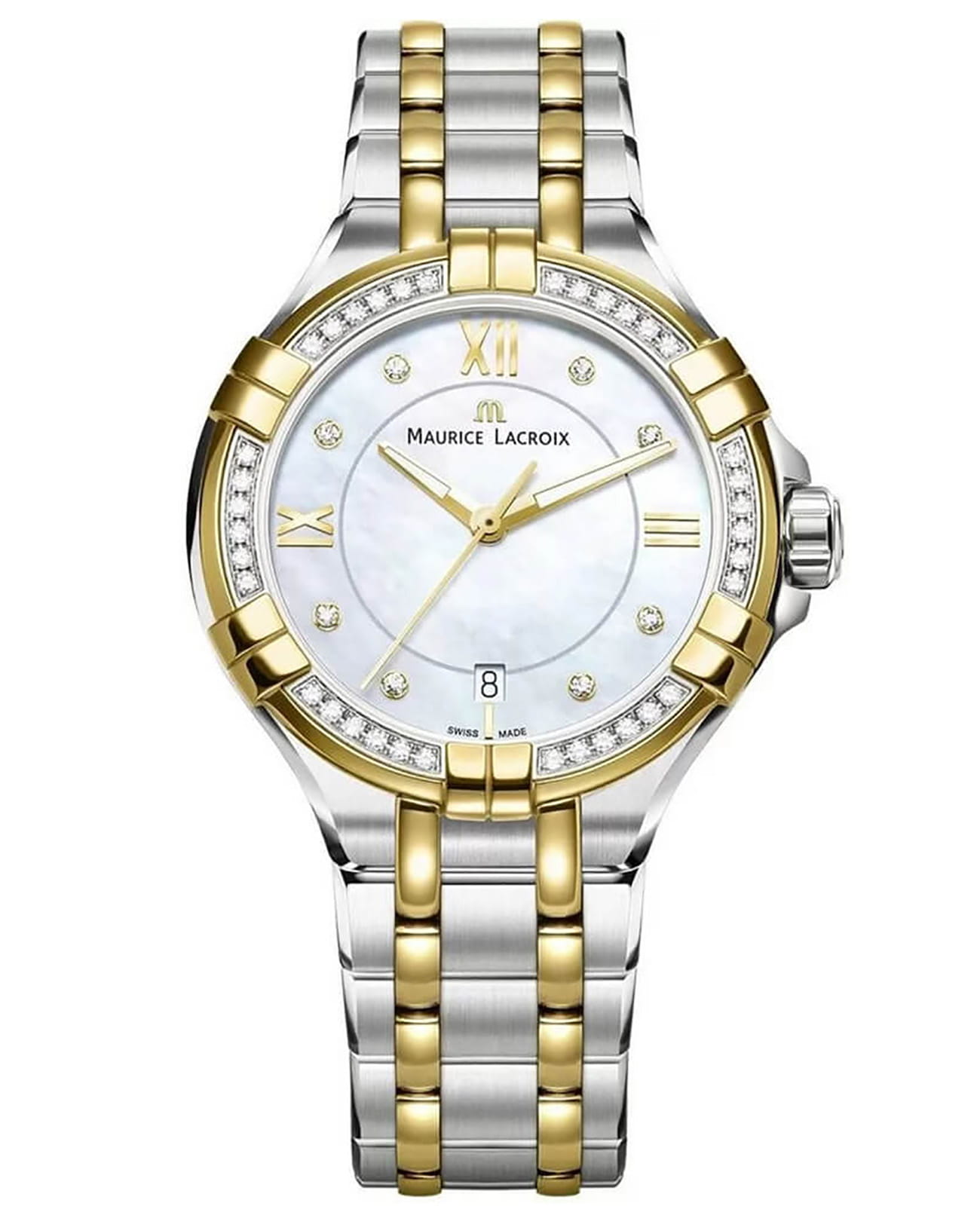 Женские швейцарские часы с бриллиантами Maurice Lacroix Aikon Quartz AI1006-PVY23-171-1, кварцевый механизм с высокой точностью. Сапфировое стекло устойчивое к появлению царапин, обладающее высокой прозрачностью. Класс водозащиты: 100 метров, позволит плавать, нырять и заниматься другими водными видами спорта. Корпус часов изготовлен из стали, разноцветного цвета.