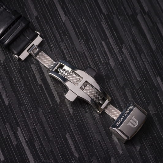 Чёрный кожаный ремешок с системой EasyChange позволяет легко менять ремешок без использования инструментов.