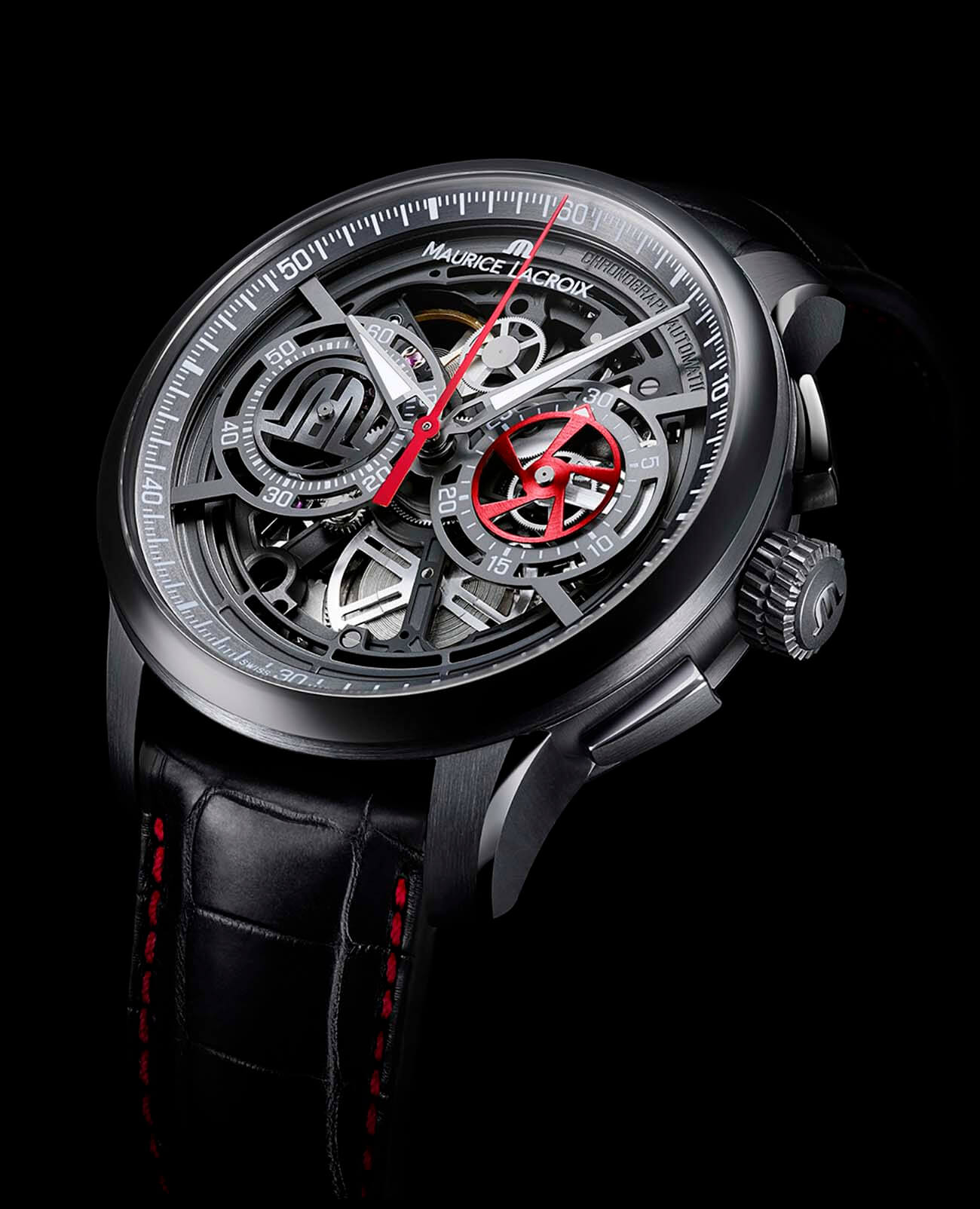 Мужские швейцарские механические часы c хронографом из ограниченной серии Maurice Lacroix Masterpiece MP6028-PVB01-001-1, механический механизм (автоматический калибр) с высокой точностью. Сапфировое стекло устойчивое к появлению царапин, обладающее высокой прозрачностью. Класс водозащиты: 100 метров, позволит плавать, нырять и заниматься другими водными видами спорта. Корпус часов изготовлен из стали, черного цвета.