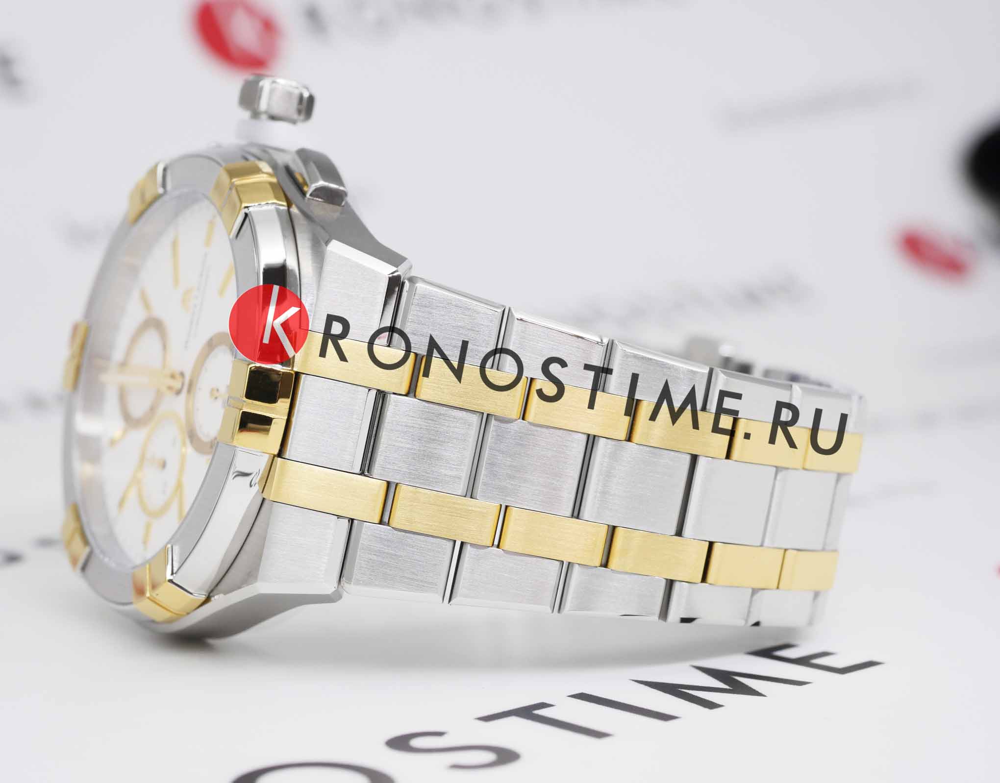 Maurice Lacroix AI1118-PVY03-130-1 из коллекции AIKON — элегантные мужские кварцевые часы, сочетающие стиль и функциональность. Корпус диаметром 42 мм выполнен из нержавеющей стали и безельБезельВнешний ободок, закрепляющий стекло. В спортивных часах так называется поворотное кольцо с делениями на циферблате, выполняет роль таймера – замеряет отрезки времени на шкале. Неподвижный безель – элемент декора. Однонаправленно вращающийся безель на дайверских часах позволяет фиксировать моменты погружения и выныривания на поверхность. с жёлтым PVD-покрытиемPVDУльтратонкое покрытие наносится в технике вакуумного напыления, сочетает в себе нитрид титана особой прочности со слоем золота или оксида хрома. Несёт в себе декоративную или защитную функцию., что придаёт часам прочность и современный вид. Сапфировое стеклоСапфировое стеклоПрочный и надёжный материал из кристалла сапфира синтетического происхождения, характеризующийся особой твёрдостью и устойчивостью к царапинам и повреждениям. с двойным антибликовым покрытием защищает от царапин и обеспечивает отличную читаемость. Белый циферблат дополнен жёлтыми позолоченными метками и стрелками с люминесцентным покрытиемЛюминесцентное покрытиеПозволяет считывать показания времени в темноте. Производители наносят на стрелки, часовые индексы, безель или поверхность циферблата светонакопительный состав, дающий холодное свечение., что улучшает видимость в условиях низкой освещённости. Окошко даты расположено на отметке «6 часов». Часы оснащены швейцарским кварцевым механизмом, обеспечивающим точный и надёжный ход. Функция хронографа включает центральную секундную стрелку, 30-минутный счётчик на отметке «9 часов» и 1/10-секундный счётчик на отметке «12 часов». Водозащита до 10 ATM (100 метров) делает их подходящими для плавания. Двухцветный браслет из нержавеющей стали с жёлтым PVD-покрытиемPVDУльтратонкое покрытие наносится в технике вакуумного напыления, сочетает в себе нитрид титана особой прочности со слоем золота или оксида хрома. Несёт в себе декоративную или защитную функцию. оснащён системой быстрой замены на застёжке-бабочке с кнопкамиЗастёжка "бабочка"Такой вид застёжки дополняется предохранителями, помогающими избежать случайного раскрытия браслета. Обладают изящным исполнением. , обеспечивая комфорт и удобство. Maurice Lacroix AI1118-PVY03-130-1 — выбор для мужчин, которые ценят стиль, функциональность и высокое качество.