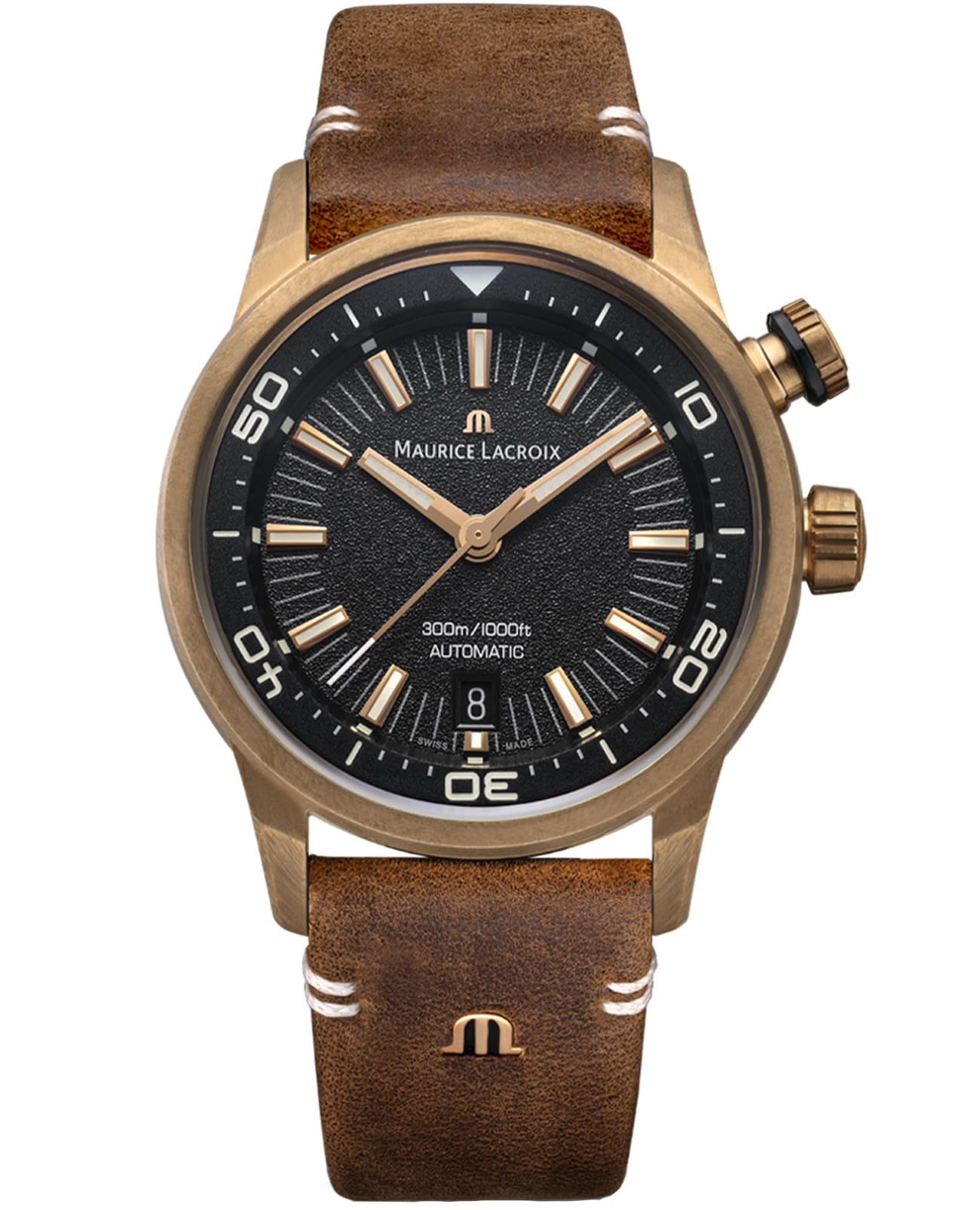 Мужские швейцарские часы Maurice Lacroix Pontos S Diver PT6248-BRZ01-330-3, механический механизм (автоматический калибр) с высокой точностью. Сапфировое стеклоСапфировое стеклоПрочный и надёжный материал из кристалла сапфира синтетического происхождения, характеризующийся особой твёрдостью и устойчивостью к царапинам и повреждениям. устойчивое к появлению царапин, обладающее высокой прозрачностью. Корпус изготовлен из бронзы. Стрелки и метки с люминесцентным покрытиемЛюминесцентное покрытиеПозволяет считывать показания времени в темноте. Производители наносят на стрелки, часовые индексы, безель или поверхность циферблата светонакопительный состав, дающий холодное свечение..Класс водозащиты: 300 метров, позволит плавать, нырять и заниматься другими водными видами спорта. Кожаный ремешок.