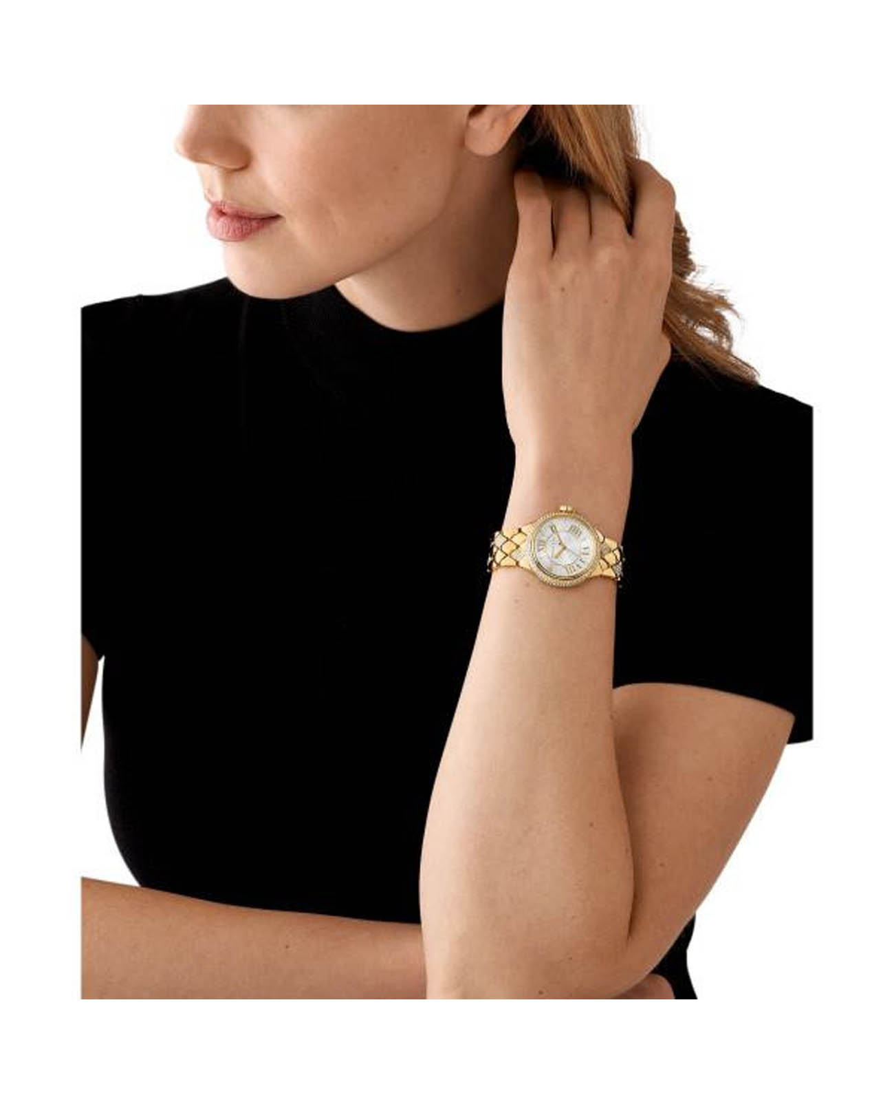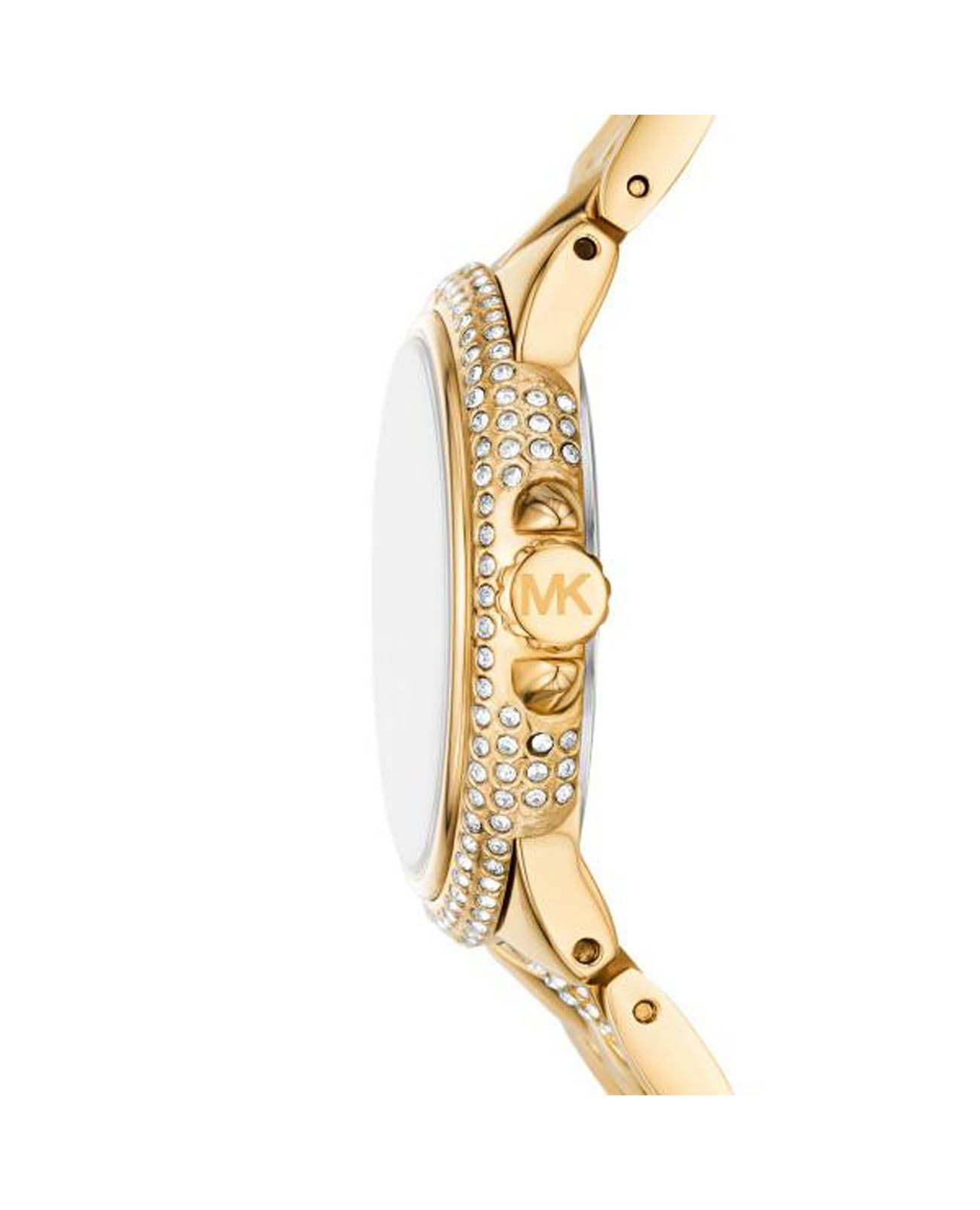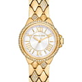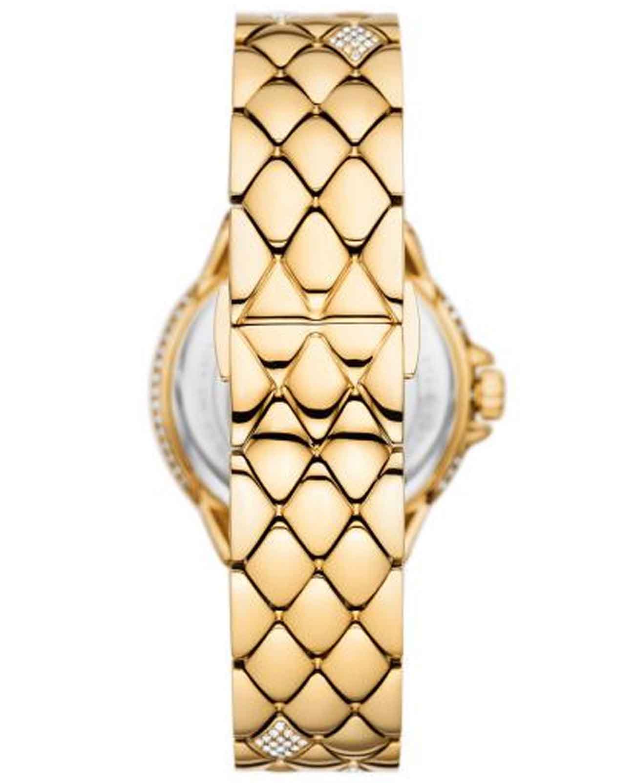 Женские американские часы с минеральным стекломМинеральное стеклоМинеральное стекло представляет собой искусственно выращенный минерал кварца. Такое стекло отличается особой устойчивостью к повреждениям и царапинам. Уступает по некоторым качествам сапфировому стеклу. Michael Kors Camille MK4801, кварцевый механизм с высокой точностью. Корпус часов изготовлен из стали с PVD-покрытиемPVDУльтратонкое покрытие наносится в технике вакуумного напыления, сочетает в себе нитрид титана особой прочности со слоем золота или оксида хрома. Несёт в себе декоративную или защитную функцию.. Браслет и безельБезельВнешний ободок, закрепляющий стекло. В спортивных часах так называется поворотное кольцо с делениями на циферблате, выполняет роль таймера – замеряет отрезки времени на шкале. Неподвижный безель – элемент декора. Однонаправленно вращающийся безель на дайверских часах позволяет фиксировать моменты погружения и выныривания на поверхность. украшены кристаллами. Метки в виде штрихов и римских цифр. Заводная головка с защитой. Класс водозащиты: 50 метров, позволит защитить корпус от случайных брызг или капель дождя. Стальной браслет с PVD-покрытиемPVDУльтратонкое покрытие наносится в технике вакуумного напыления, сочетает в себе нитрид титана особой прочности со слоем золота или оксида хрома. Несёт в себе декоративную или защитную функцию. на застёжке-бабочке с кнопкамиЗастёжка "бабочка"Такой вид застёжки дополняется предохранителями, помогающими избежать случайного раскрытия браслета. Обладают изящным исполнением. .