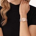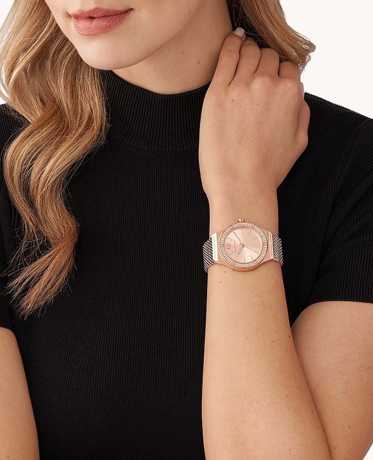 Женские часы Michael Kors Lennox MK7336, кварцевый механизм с высокой точностью. Минеральное стеклоМинеральное стеклоМинеральное стекло представляет собой искусственно выращенный минерал кварца. Такое стекло отличается особой устойчивостью к повреждениям и царапинам. Уступает по некоторым качествам сапфировому стеклу. устойчивое к появлению царапин, обладающее высокой прозрачностью. Корпус и браслет изготовлены из нержавеющей стали c PVDPVDУльтратонкое покрытие наносится в технике вакуумного напыления, сочетает в себе нитрид титана особой прочности со слоем золота или оксида хрома. Несёт в себе декоративную или защитную функцию. покрытием. БезельБезельВнешний ободок, закрепляющий стекло. В спортивных часах так называется поворотное кольцо с делениями на циферблате, выполняет роль таймера – замеряет отрезки времени на шкале. Неподвижный безель – элемент декора. Однонаправленно вращающийся безель на дайверских часах позволяет фиксировать моменты погружения и выныривания на поверхность. из нержавеющей стали c PVDPVDУльтратонкое покрытие наносится в технике вакуумного напыления, сочетает в себе нитрид титана особой прочности со слоем золота или оксида хрома. Несёт в себе декоративную или защитную функцию. покрытием и украшен кристаллами. Метки на цифебрлате в виде штрихов. Стрелки с люминесцентным покрытиемЛюминесцентное покрытиеПозволяет считывать показания времени в темноте. Производители наносят на стрелки, часовые индексы, безель или поверхность циферблата светонакопительный состав, дающий холодное свечение.. Класс водозащиты: 50 метров, позволит защитить корпус от случайных брызг или капель дождя. Стальной браслет на раскладной застёжкеРаскладная застёжкаТакой тип застёжки используется только на браслетах из металла. Она никогда не раскрывается полностью, происходит разделение на 2 и более частей. Раскладывающая застёжка снизит вероятность потери часов к минимуму..