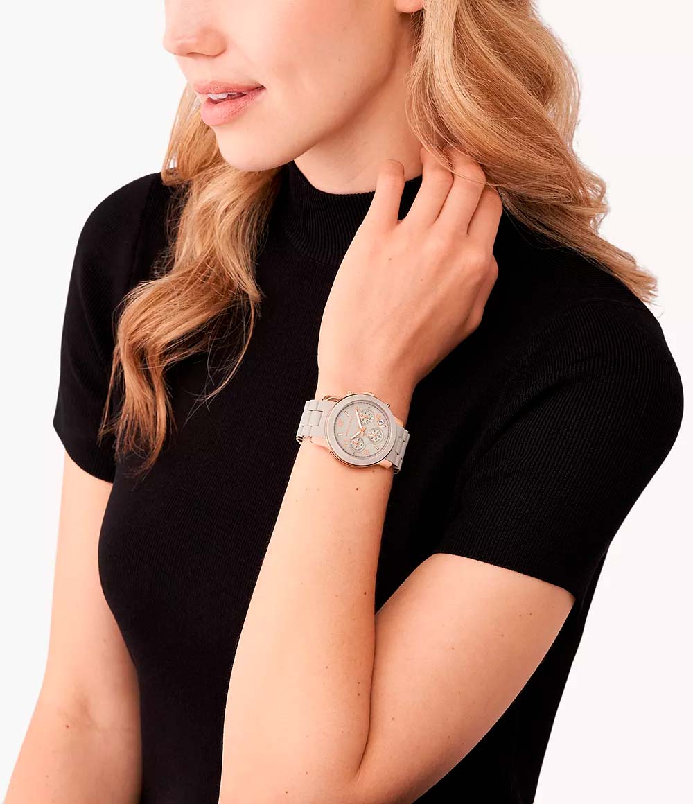 Женские американские часы-хронографХронографФункция позволяет измерять отрезки времени с особой точностью: часы, минуты, секунды. Верным признаком хронографа является наличие на циферблате 3 дополнительных окошек-счётчиков. с секундомеромСекундомерСекундоме́р — прибор, способный измерять интервалы времени с точностью до долей секунды. и с минеральным стекломМинеральное стеклоМинеральное стекло представляет собой искусственно выращенный минерал кварца. Такое стекло отличается особой устойчивостью к повреждениям и царапинам. Уступает по некоторым качествам сапфировому стеклу. Michael Kors Runway MK7386, кварцевый механизм с высокой точностью. Корпус часов изготовлен из нержавеющей стали с PVD-покрытиемPVDУльтратонкое покрытие наносится в технике вакуумного напыления, сочетает в себе нитрид титана особой прочности со слоем золота или оксида хрома. Несёт в себе декоративную или защитную функцию.. Три дополнительных индикатора на циферблате. Метки в виде штрихов и цифр. Стрелки и метки с люминесцентным покрытиемЛюминесцентное покрытиеПозволяет считывать показания времени в темноте. Производители наносят на стрелки, часовые индексы, безель или поверхность циферблата светонакопительный состав, дающий холодное свечение.. Окошко даты находится между 4 и 5 часами. Класс водозащиты: 100 метров, позволит плавать, нырять и заниматься другими водными видами спорта. Стальной браслет из нержавеющей стали с PVD-покрытиемPVDУльтратонкое покрытие наносится в технике вакуумного напыления, сочетает в себе нитрид титана особой прочности со слоем золота или оксида хрома. Несёт в себе декоративную или защитную функцию. и силикона на раскладной застёжкеРаскладная застёжкаТакой тип застёжки используется только на браслетах из металла. Она никогда не раскрывается полностью, происходит разделение на 2 и более частей. Раскладывающая застёжка снизит вероятность потери часов к минимуму..
