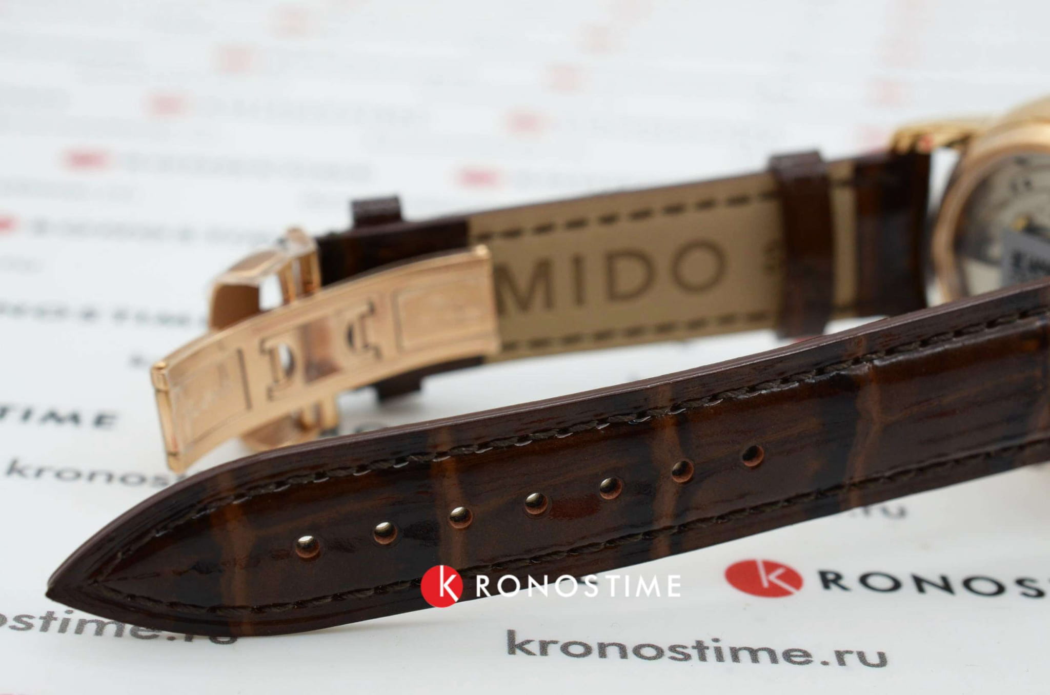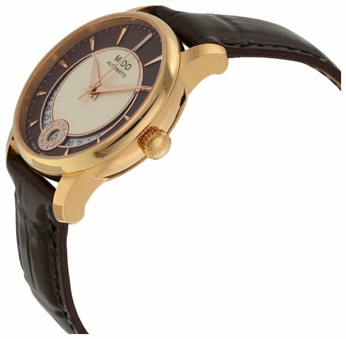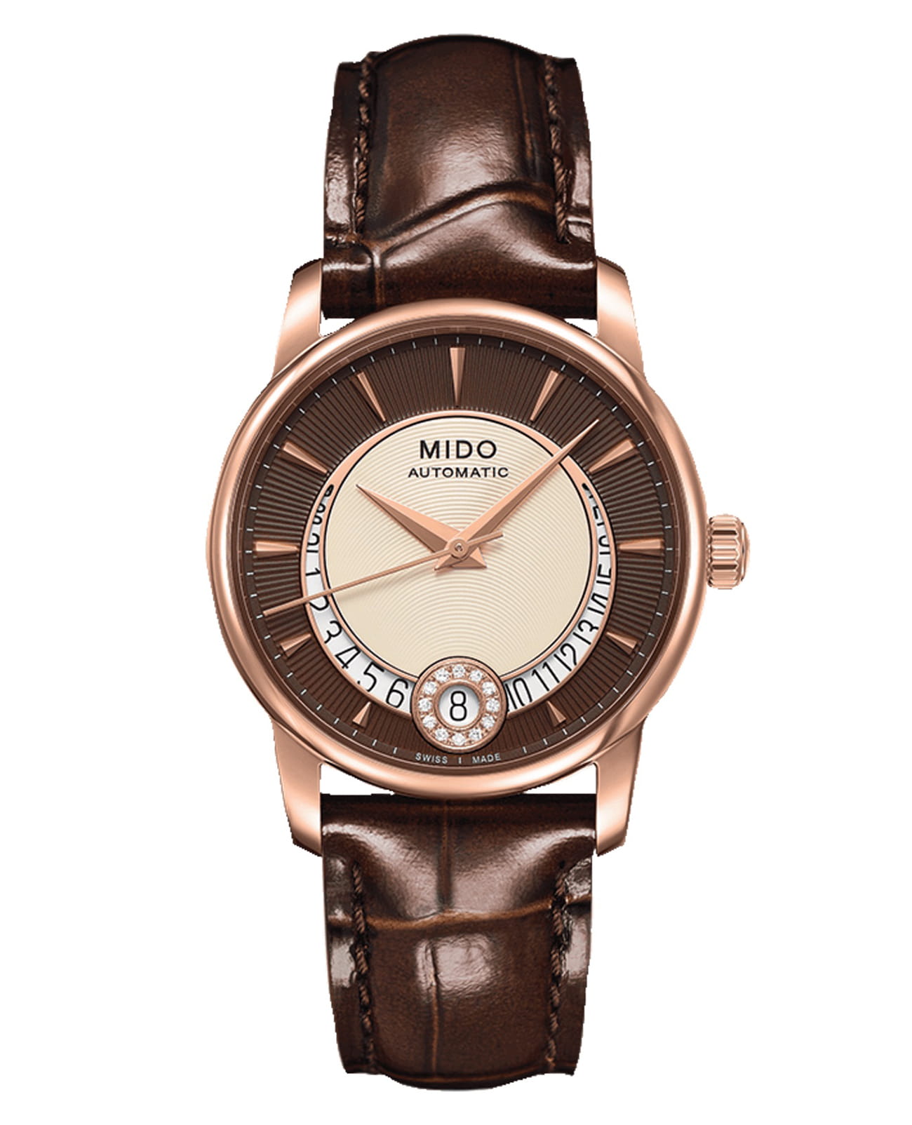 Mido Baroncelli Diamonds M007.207.36.291.00 – элегантные женские часы, сочетающие классический стиль и современные технологии. Корпус диаметром 33 мм и толщиной 9,4 мм выполнен из нержавеющей стали с PVD-покрытиемPVDУльтратонкое покрытие наносится в технике вакуумного напыления, сочетает в себе нитрид титана особой прочности со слоем золота или оксида хрома. Несёт в себе декоративную или защитную функцию. розового золота, обеспечивая прочность и стильный внешний вид. Бежево-коричневый циферблат украшен бриллиантами, окружающими окошко даты на позиции «6 часов», добавляя изысканности и блеска, а его поверхность защищена сапфировым стекломСапфировое стеклоПрочный и надёжный материал из кристалла сапфира синтетического происхождения, характеризующийся особой твёрдостью и устойчивостью к царапинам и повреждениям. с антибликовым покрытиемАнтибликовое покрытиеСлой оксида металла в 0,13-0,3 микрон, благодаря которому стекло часов не бликует и не отражает свет. Антибликовое покрытие уменьшает отражение света в 10 раз, обеспечивая отличную читаемость показателей циферблата., устойчивым к царапинам.