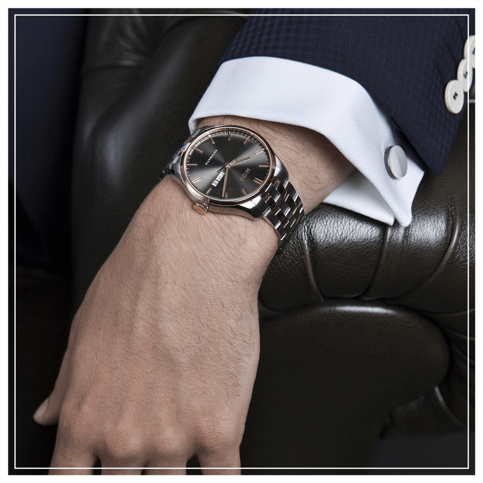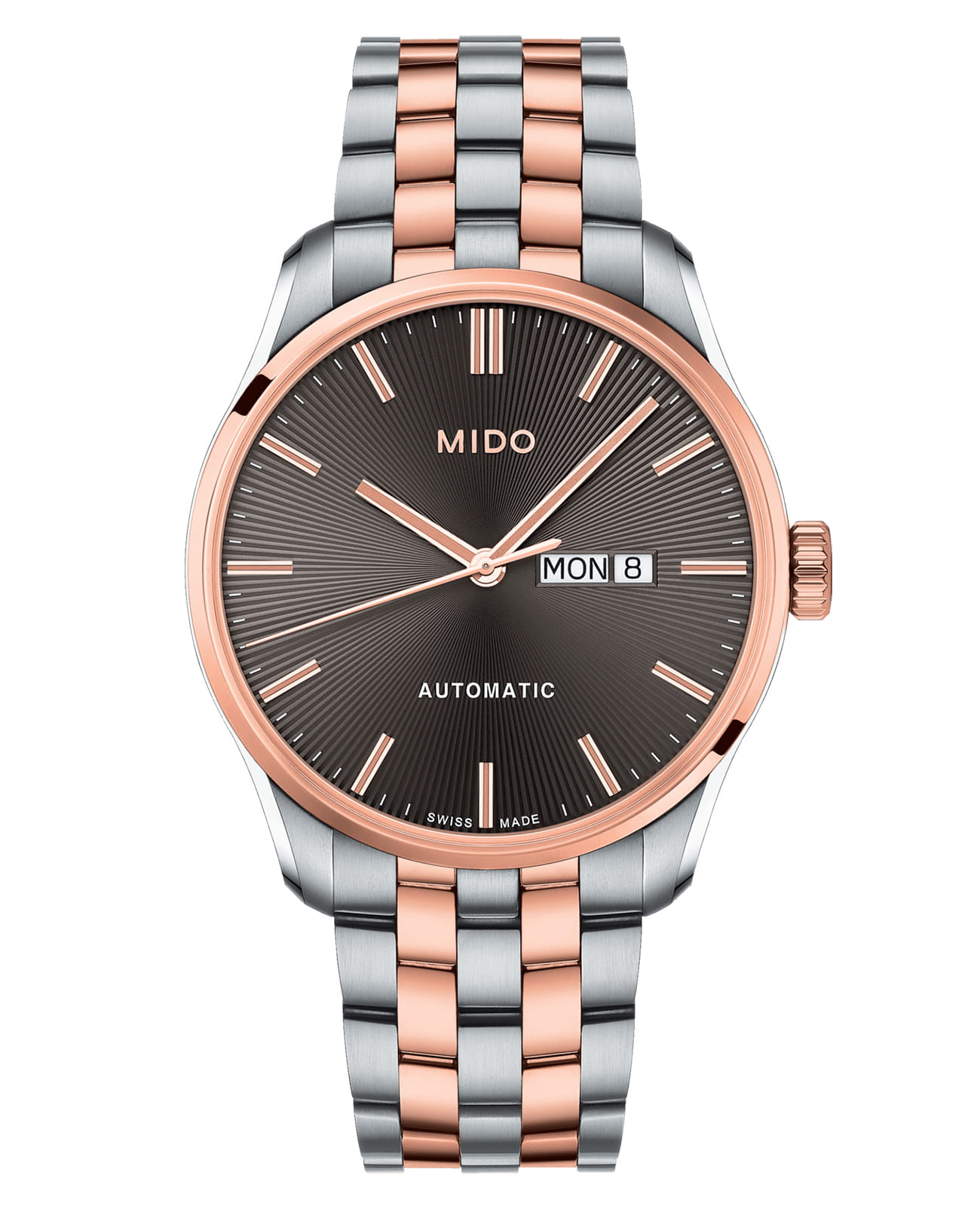 Часы MIDO Belluna Sunray (артикул M024.630.22.061.00) — элегантная модель, сочетающая современный дизайн и швейцарское качество. Корпус диаметром 42,5 мм выполнен из нержавеющей стали с PVD-покрытиемPVDУльтратонкое покрытие наносится в технике вакуумного напыления, сочетает в себе нитрид титана особой прочности со слоем золота или оксида хрома. Несёт в себе декоративную или защитную функцию. розового золота и водозащитой до 5 бар (50 метров). Антрацитовый циферблат с узором «солнечные лучи» и накладными часовыми метками защищён сапфировым стекломСапфировое стеклоПрочный и надёжный материал из кристалла сапфира синтетического происхождения, характеризующийся особой твёрдостью и устойчивостью к царапинам и повреждениям..