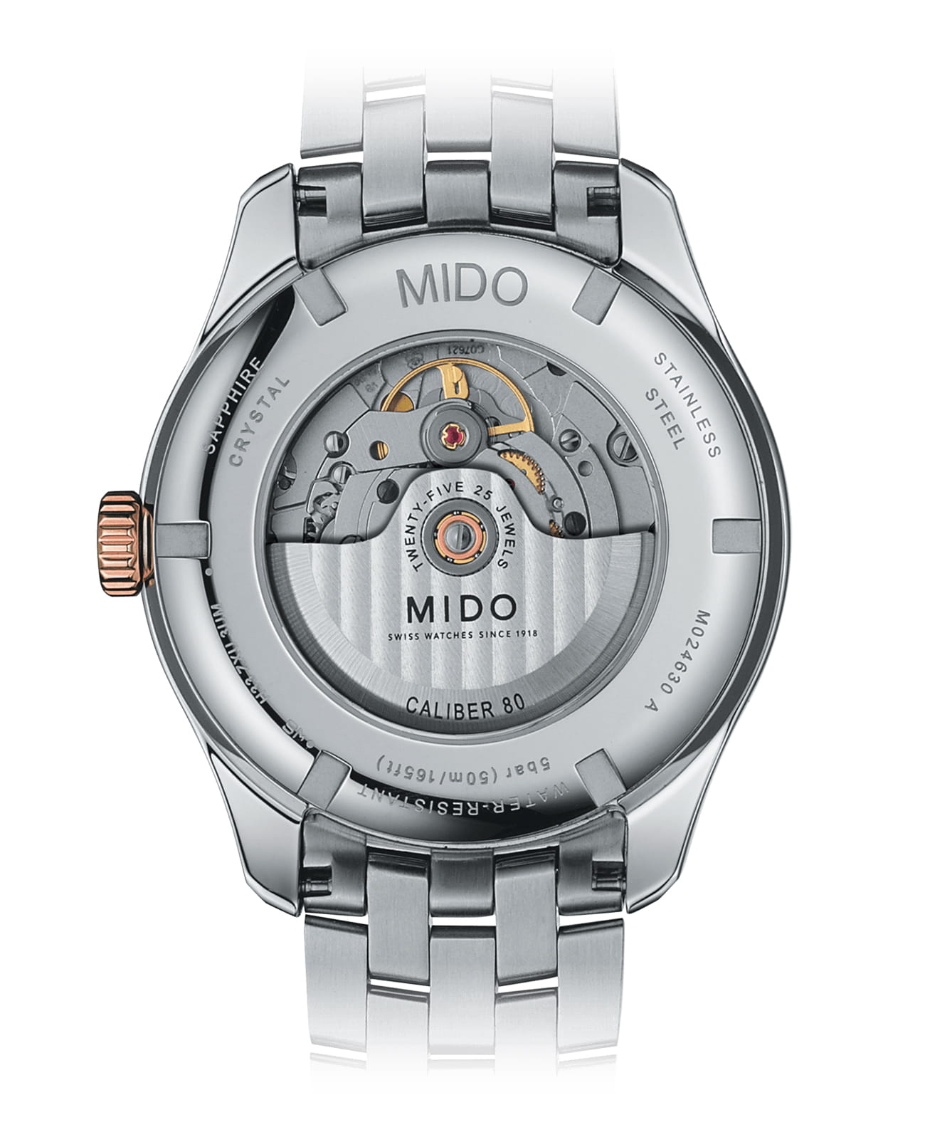 Модель оснащена автоматическим механизмом MIDO Caliber 80 (на базе ETA C07.621), обеспечивающим запас хода до 80 часов. Функционал включает индикацию часов, минут, секунд, дня недели и даты, расположенных в положении «3 часа».
