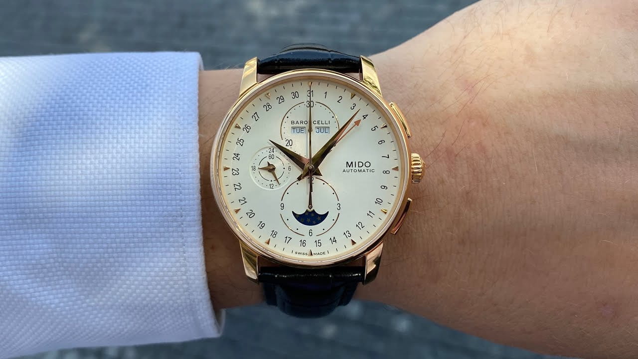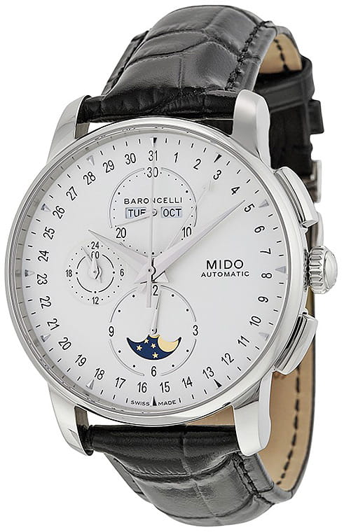 Швейцарские мужские наручные часы Mido Baroncelli 8607.4.M1.42, механический механизм (автоматический калибр) с высокой точностью. Сапфировое стеклоСапфировое стеклоПрочный и надёжный материал из кристалла сапфира синтетического происхождения, характеризующийся особой твёрдостью и устойчивостью к царапинам и повреждениям. устойчивое к появлению царапин, обладающее высокой прозрачностью. Класс водозащиты: 50 метров, позволит защитить корпус от случайных брызг или капель дождя. Корпус часов изготовлен из стали, серебристого цвета. В модели есть хронографХронографФункция позволяет измерять отрезки времени с особой точностью: часы, минуты, секунды. Верным признаком хронографа является наличие на циферблате 3 дополнительных окошек-счётчиков., 12-часовой счетчик расположен на 6 часов, 30-минутный на 12 часов и малая секунда на 9 часов. Центральная стрелка-указатель даты, апертура месяца и дня недели лаконично расположена на 12 часов, индикатор фазы луны.