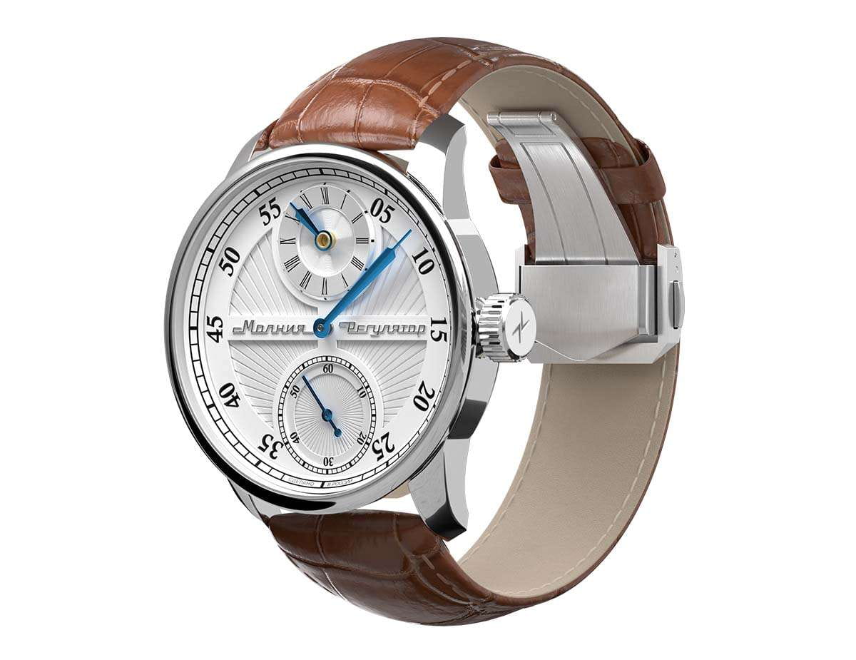 Мужские механические часы с ручным подзаводом — это аксессуар от легендарного бренда «МОЛНИЯ», созданный на Челябинском часовом заводе. Корпус диаметром 42 мм выполнен из нержавеющей стали. Циферблат оформлен индексами и стрелками. Малая секундная стрелка вынесена на отдельный субциферблат. Циферблат защищён сапфировым стекломСапфировое стеклоПрочный и надёжный материал из кристалла сапфира синтетического происхождения, характеризующийся особой твёрдостью и устойчивостью к царапинам и повреждениям.. Механизм — мануфактурный калибр 3603RS, полностью собранный вручную, с декорированными деталями, которые видны через прозрачную заднюю крышку. Часы оснащены кожаным ремешком коричневого цвета с раскладной застёжкойРаскладная застёжкаТакой тип застёжки используется только на браслетах из металла. Она никогда не раскрывается полностью, происходит разделение на 2 и более частей. Раскладывающая застёжка снизит вероятность потери часов к минимуму.. Водонепроницаемость 100 м позволяет использовать часы для плавания и повседневного ношения. Идеальный выбор для тех, кто ценит российское качество и традиции.
