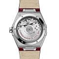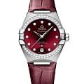 Драматичный и запоминающийся дизайн OMEGA Constellation характеризуется знаменитыми гранями полумесяца и «скобами» на корпусе. Эта 36-миллиметровая модель из нержавеющей стали оснащена полированным безелемБезельВнешний ободок, закрепляющий стекло. В спортивных часах так называется поворотное кольцо с делениями на циферблате, выполняет роль таймера – замеряет отрезки времени на шкале. Неподвижный безель – элемент декора. Однонаправленно вращающийся безель на дайверских часах позволяет фиксировать моменты погружения и выныривания на поверхность. с 38 бриллиантами, бордовым циферблатом с PVDPVDУльтратонкое покрытие наносится в технике вакуумного напыления, сочетает в себе нитрид титана особой прочности со слоем золота или оксида хрома. Несёт в себе декоративную или защитную функцию.-покрытием, матовым покрытием и окошком даты в положении «6 часов». Стрелки, логотип OMEGA, звезда Constellation и индексы выполнены из белого золота 18 карат18-каратное золотоОбозначение по каратной системе пробирования, оно показывает, сколько драгоценного металла содержится в изделии. 18 карат - в составе 75% чистого золота, соответствует 750 пробе.