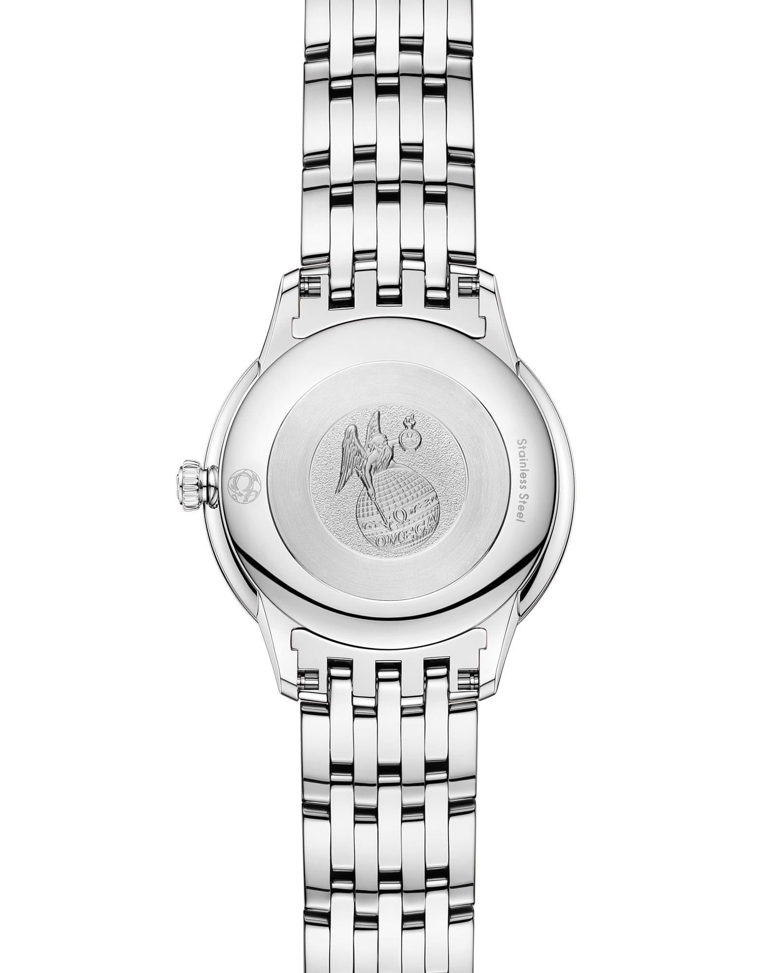 Коллекция OMEGA De Ville Prestige, сохраняющая свою актуальность с 1994 года, предстает в третьем поколении. Эти часы продолжают быть символом классического дизайна и утонченной элегантности. Модели, которые привлекают внимание разнообразием узоров, отделок и цветов, идеально подходят для людей с различными стилями жизни и характерами. Часы в корпусе диаметром 27,5 мм из нержавеющей стали имеют циферблат с PVD-покрытиемPVDУльтратонкое покрытие наносится в технике вакуумного напыления, сочетает в себе нитрид титана особой прочности со слоем золота или оксида хрома. Несёт в себе декоративную или защитную функцию. синего цвета, украшенный рельефным произвольным вертикальным узором и радиальным сатинированием. На циферблате расположены стрелки с родиевым покрытием, а также чередующиеся римские цифры и индексы в форме кабошона. Изделие с лаконичным дизайном дополнено задней крышкой, украшенной рельефным медальоном с изображением бога времени Хроноса. Часы представлены с браслетом из нержавеющей стали. Модель оснащена кварцевым механизмом OMEGA 4061, который обеспечивает срок службы элемента питания не менее 48 месяцев.
