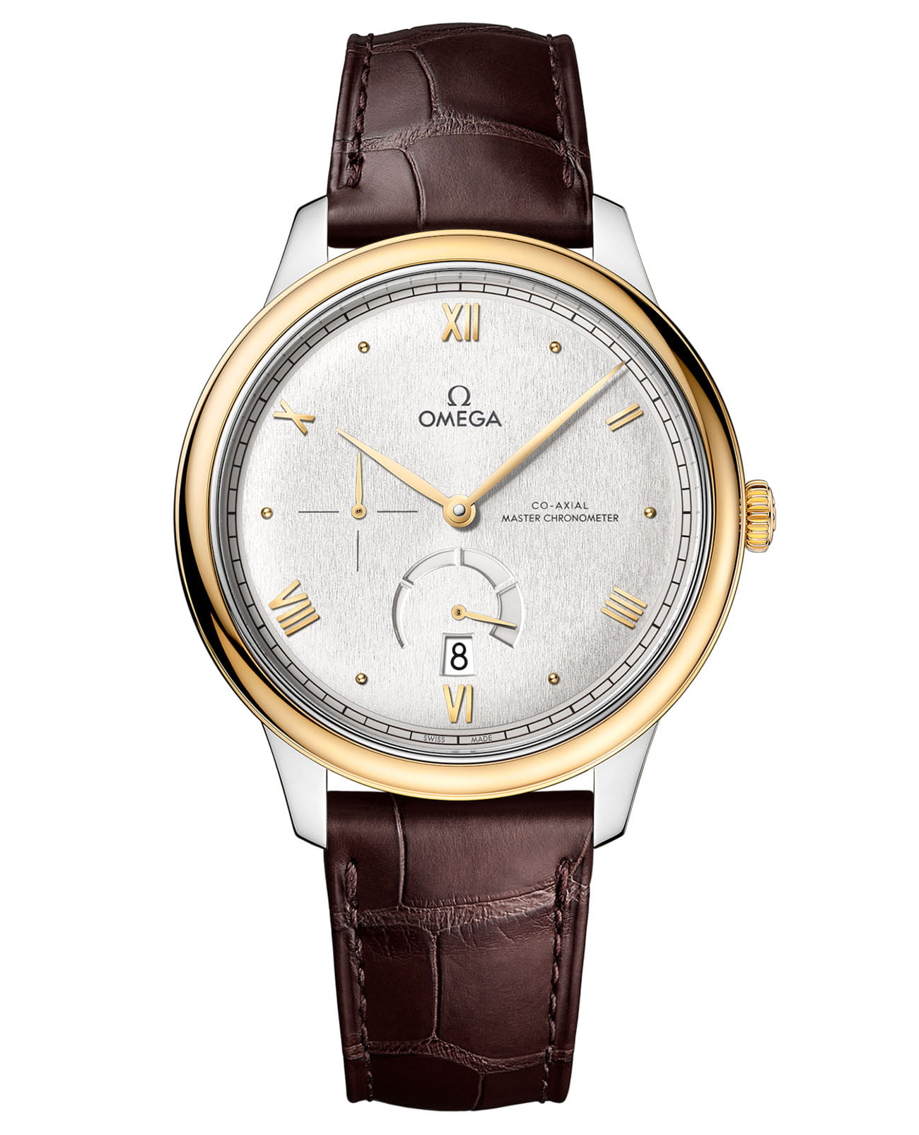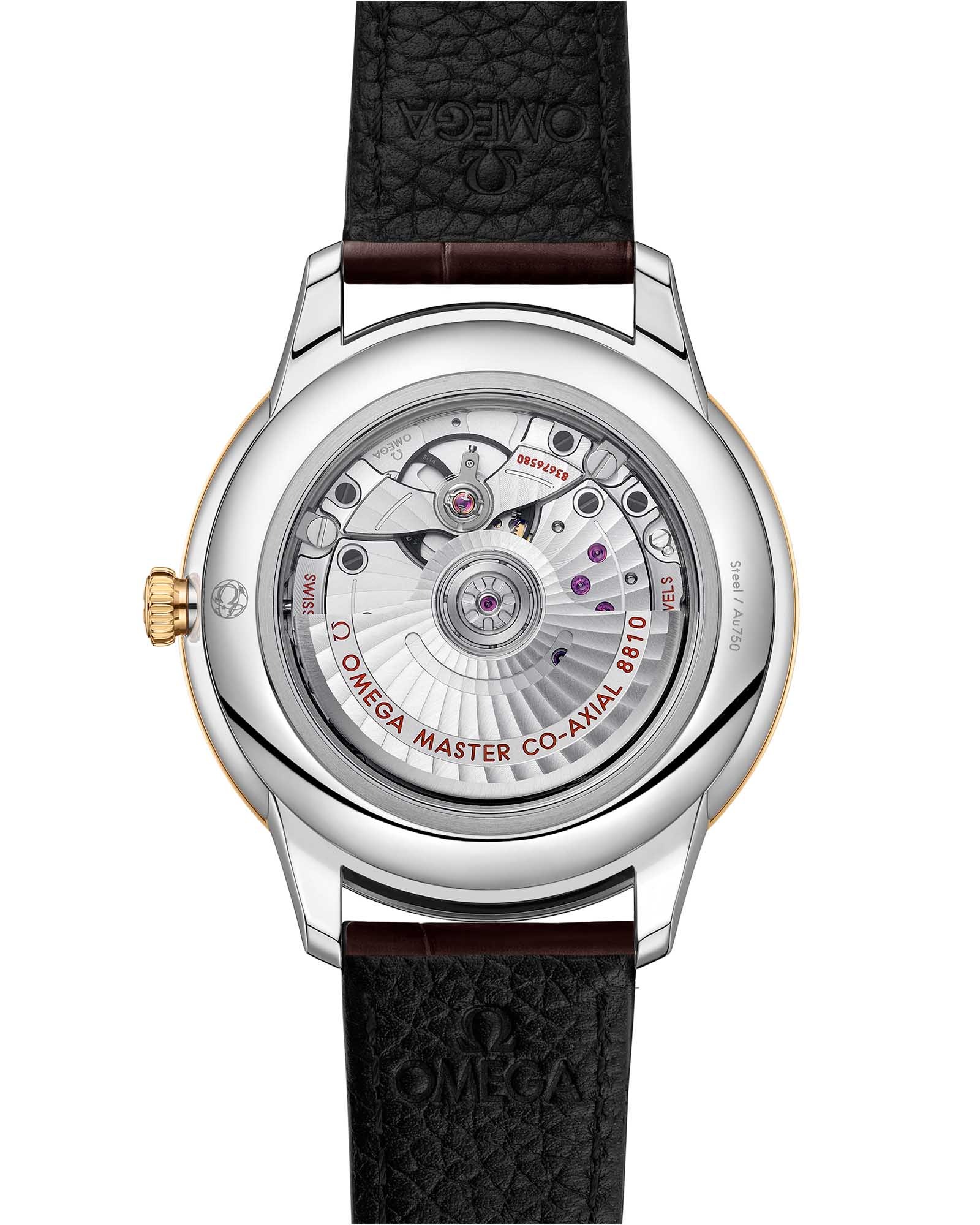 , а также чередующиеся римские цифры и индексы в форме кабошона. 270-градусный индикатор запаса хода расположен в положении "6 часов". Он имеет двухслойную конструкцию в форме полумесяца, состояющую из нижней пластины с изящной контрастной отделкой, выполненной в одной цветовой гамме, и верхней пластины с 4-я секторальными прорезями. Изделие с лаконичным дизайном дополнено окошком указателя даты в положении «6 часов», счетчиком малой секундной стрелки в положении «9 часов» и минутной шкалой в стиле «железная дорога» на внешнем секторе. Часы с сертификатом Master Chronometer представлены с кожаным ремешком коричневого цвета. Модель оснащена калибром OMEGA Master Co-Axial 8810, который виден сквозь устойчивое к царапинам сапфировое стеклоСапфировое стеклоПрочный и надёжный материал из кристалла сапфира синтетического происхождения, характеризующийся особой твёрдостью и устойчивостью к царапинам и повреждениям. задней крышки корпуса.