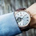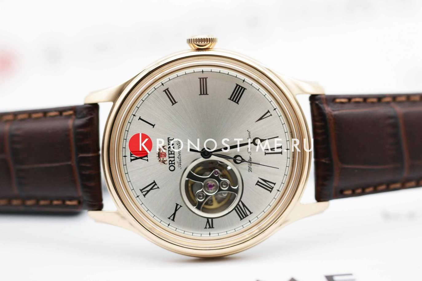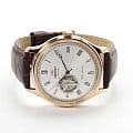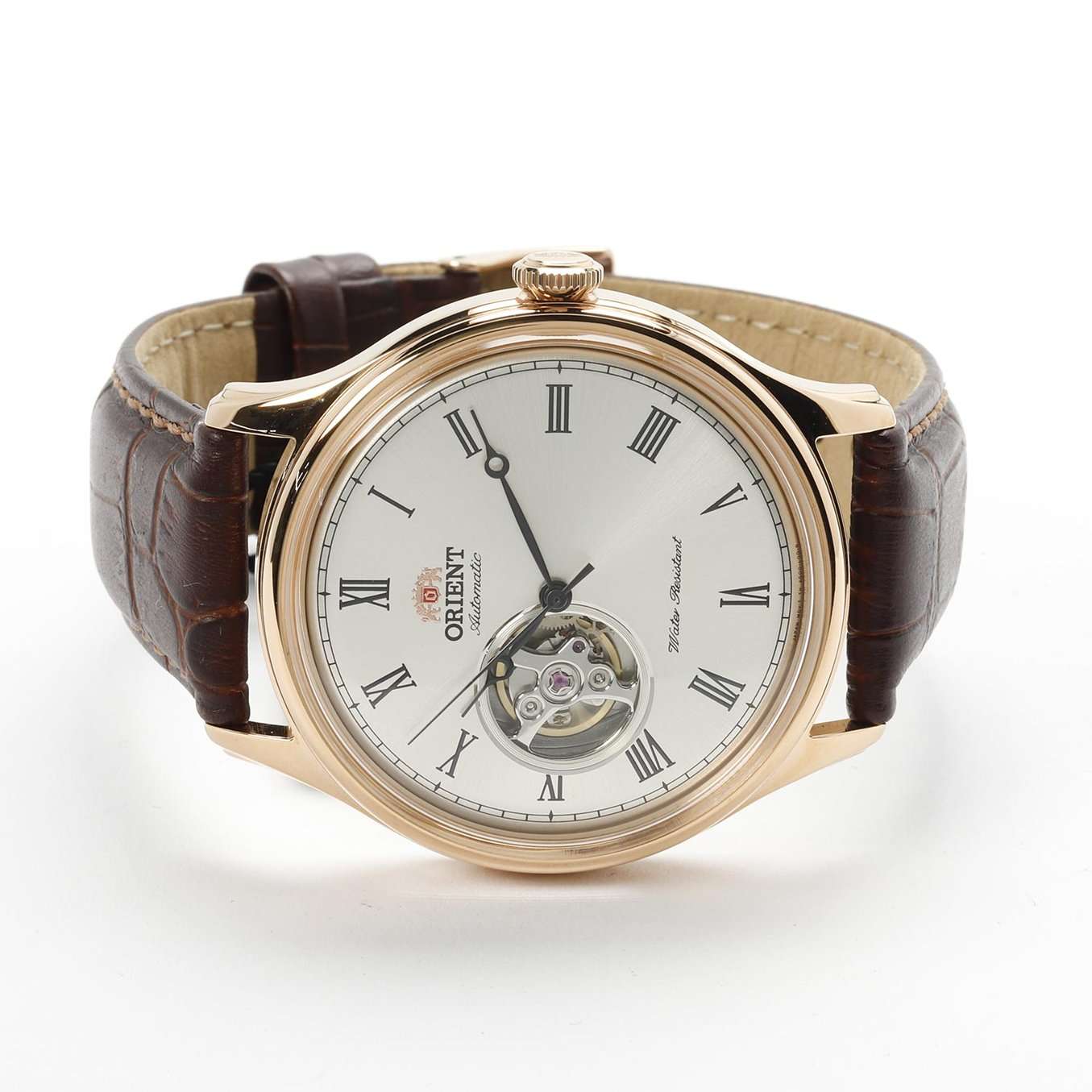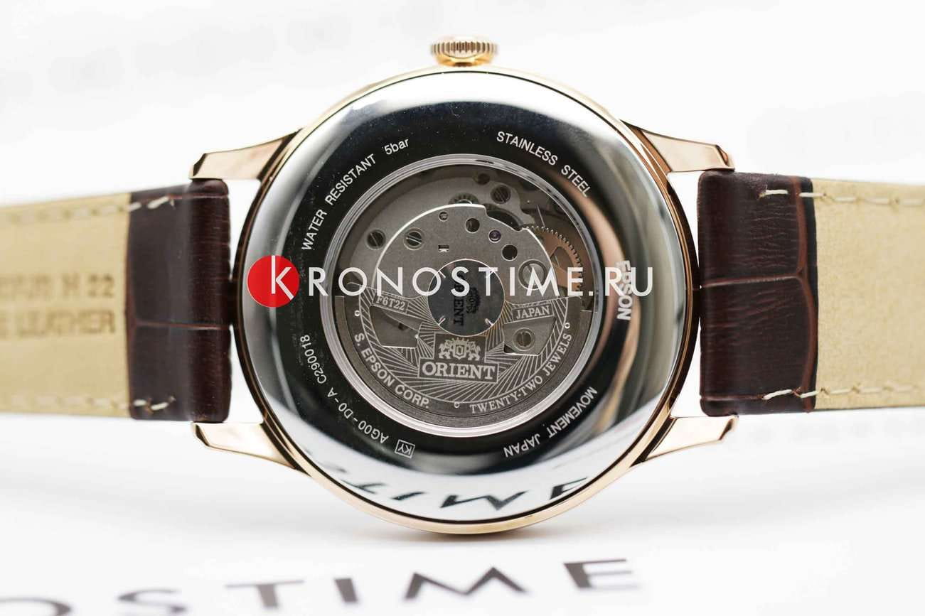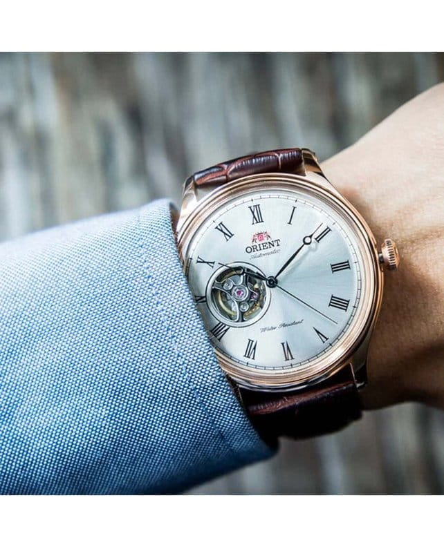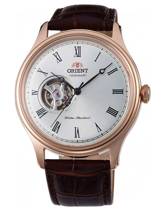 Orient Classic Open Heart AG00001S — это элегантные классические часы с утонченным дизайном и надежным механизмом. Корпус диаметром 43 мм выполнен из нержавеющей стали с PVD-покрытиемPVDУльтратонкое покрытие наносится в технике вакуумного напыления, сочетает в себе нитрид титана особой прочности со слоем золота или оксида хрома. Несёт в себе декоративную или защитную функцию. розового цвета, что придает модели изысканный и благородный вид. Циферблат шампанского оттенка украшен римскими цифрами и черными стрелками, обеспечивая четкость отображения времени. Окошко "Open Heart" на отметке 9 часов позволяет наблюдать за работой механизма. Защиту циферблата обеспечивает минеральное стеклоМинеральное стеклоМинеральное стекло представляет собой искусственно выращенный минерал кварца. Такое стекло отличается особой устойчивостью к повреждениям и царапинам. Уступает по некоторым качествам сапфировому стеклу. с выпуклой формой. Внутри установлен автоматический механизм Orient калибра F6T22 с возможностью ручного подзавода и функцией стоп-секунды, обеспечивающий точность и запас хода до 40 часов. Модель комплектуется коричневым кожаным ремешком с тиснением под крокодила, а классическая застёжка обеспечивает комфортное и надежное ношение. Водонепроницаемость 50 метров защищает часы от брызг и кратковременного контакта с водой, делая их идеальным выбором для повседневного использования.