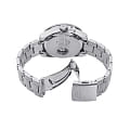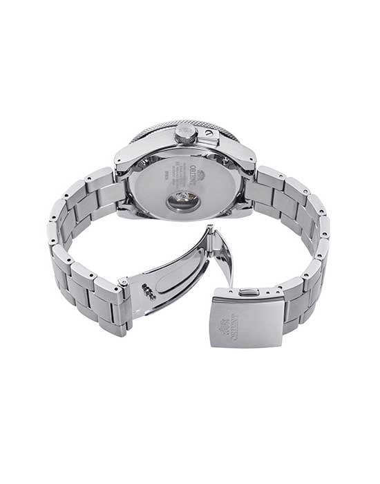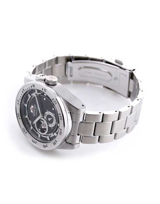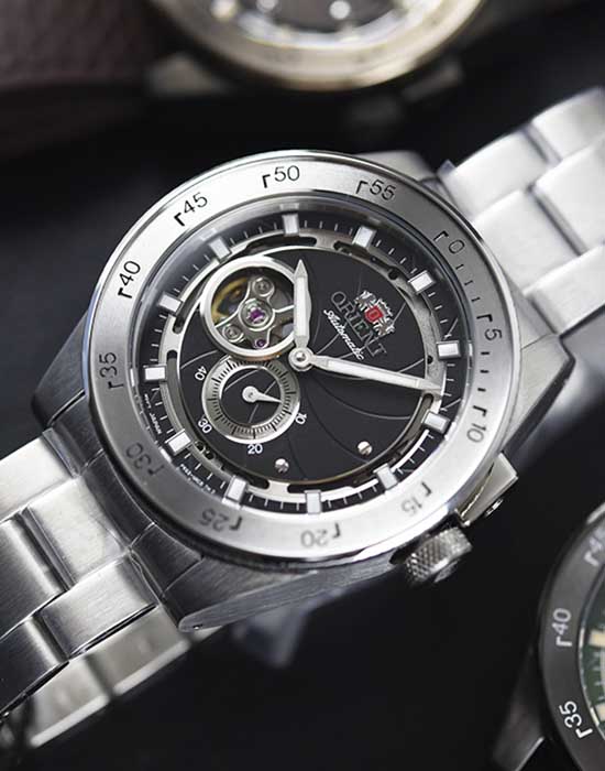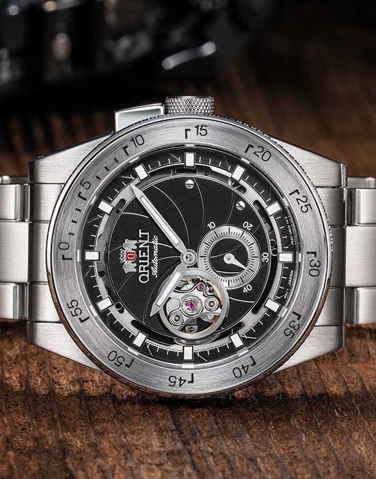 Orient RA-AR0201B — необычные и стильные часы из коллекции Revival, вдохновлённые эстетикой ретро-фотоаппаратов. Корпус диаметром 40,8 мм выполнен из нержавеющей стали с матовой отделкой. Безель стилизован под кольцо диафрагмы объектива, а заводная головка с защитой отсылает к рычагу перемотки плёнки, подчёркивая характерный винтажный образ. Чёрный циферблат с гильоше в форме лепестков оснащён открытым балансом на «9 часах» и малым секундным индикатором на «6 часах». Часовые метки и стрелки покрыты люминесцентным покрытиемЛюминесцентное покрытиеПозволяет считывать показания времени в темноте. Производители наносят на стрелки, часовые индексы, безель или поверхность циферблата светонакопительный состав, дающий холодное свечение. для надёжной читаемости в темноте. Циферблат защищён минеральным стекломМинеральное стеклоМинеральное стекло представляет собой искусственно выращенный минерал кварца. Такое стекло отличается особой устойчивостью к повреждениям и царапинам. Уступает по некоторым качествам сапфировому стеклу.. Внутри установлен японский автоматический механизм Orient F6S22 с 22 камнями, функцией ручного завода и стоп-секундой. Запас хода составляет до 40 часов. Модель комплектуется браслетом из нержавеющей стали с раскладной застёжкойРаскладная застёжкаТакой тип застёжки используется только на браслетах из металла. Она никогда не раскрывается полностью, происходит разделение на 2 и более частей. Раскладывающая застёжка снизит вероятность потери часов к минимуму., обеспечивающей надёжную посадку на запястье. Водонепроницаемость 50 метров делает часы устойчивыми к повседневным воздействиям воды.