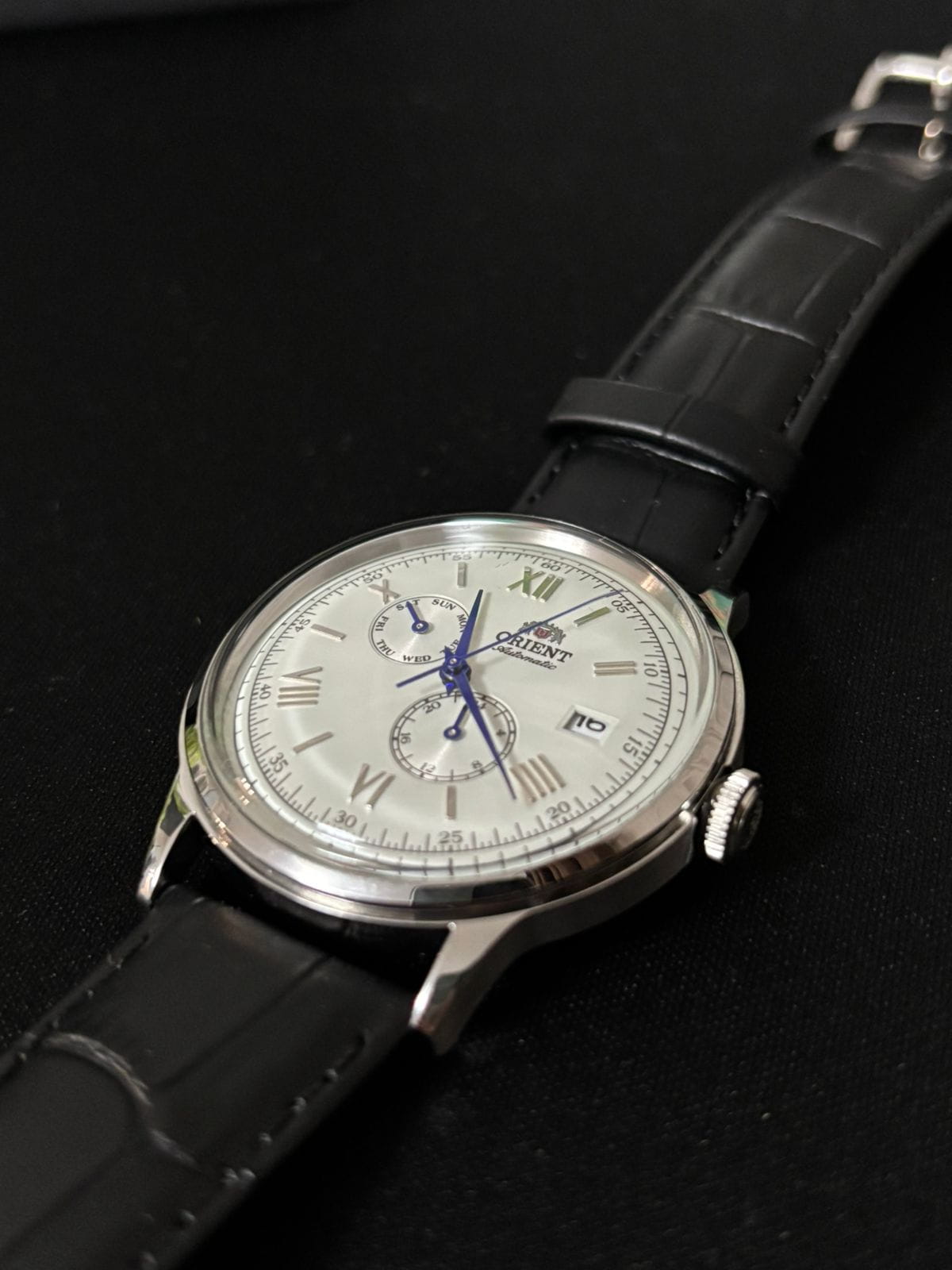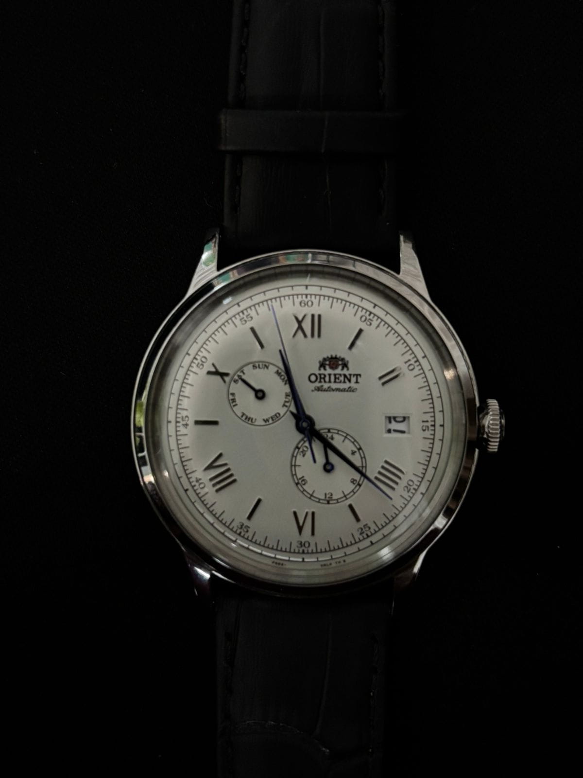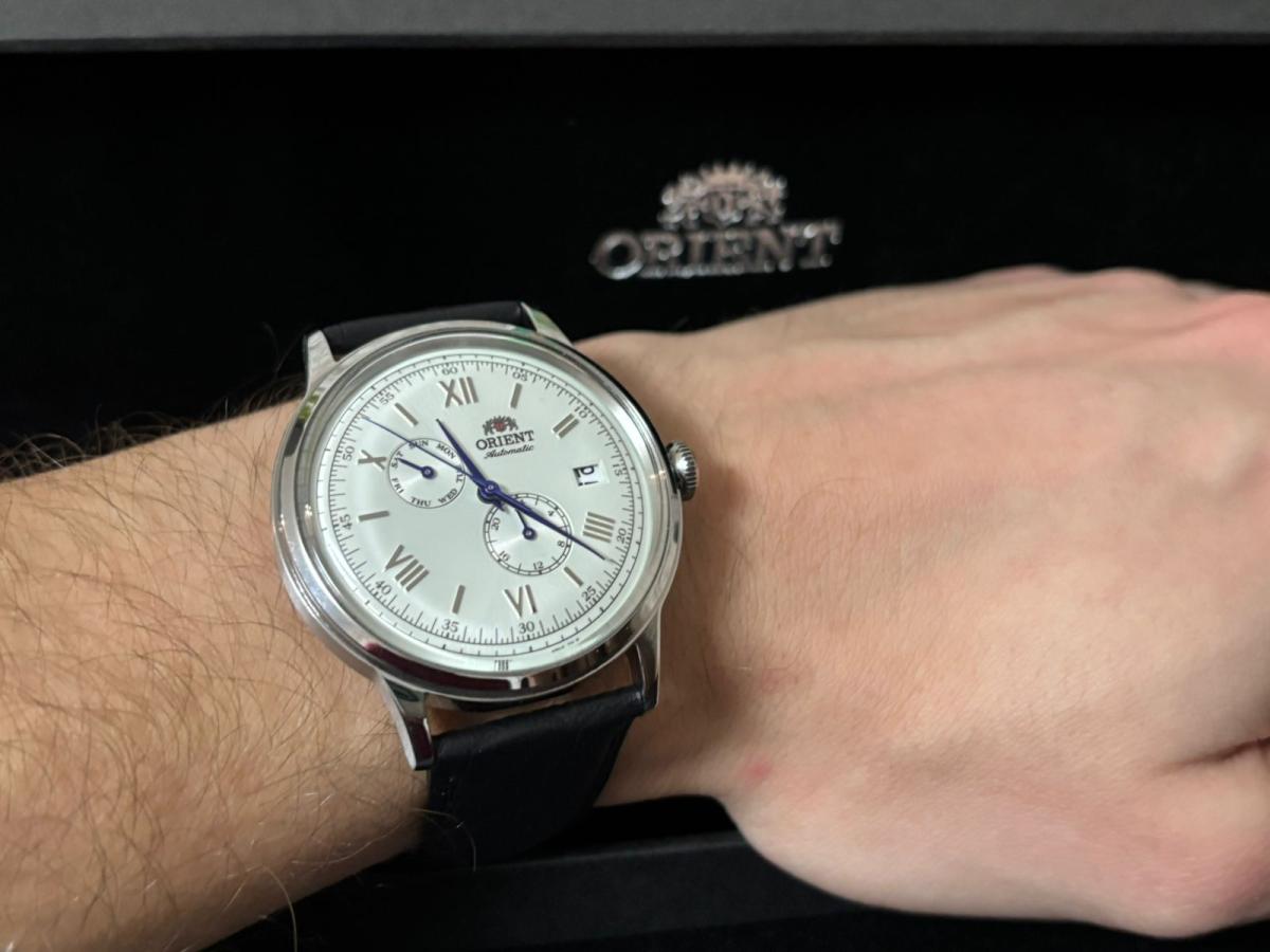 Часы Orient Bambino Version 8 RN-AK0701S — это утончённое сочетание классики и современных функций. Корпус из нержавеющей стали диаметром 40,5 мм защищён выпуклым Минеральным стекломМинеральное стеклоМинеральное стекло представляет собой искусственно выращенный минерал кварца. Такое стекло отличается особой устойчивостью к повреждениям и царапинам. Уступает по некоторым качествам сапфировому стеклу., которое добавляет ретро-очарование и защищает циферблат от повреждений. Светлый циферблат украшен римскими цифрами, а дополнительные индикаторы включают указатель дня недели на отметке «10 часов», 24-часовой индикатор на «5 часах» и окошко даты на «3 часах». Это делает часы не только элегантными, но и практичными. Автоматический механизм Orient Calibre F6B22 с функцией ручного завода и остановки секундной стрелки гарантирует точность и надёжность. Запас хода до 40 часов обеспечивает удобство в повседневной жизни. Чёрный кожаный ремешок с классической пряжкой обеспечивает комфортное ношение и дополняет изысканный облик модели. Водонепроницаемость до 30 метров защищает часы от случайных брызг, подчёркивая их практичность. Orient Bambino Version 8 RN-AK0701S — это выбор для тех, кто ценит стиль, функциональность и традиции часового искусства.