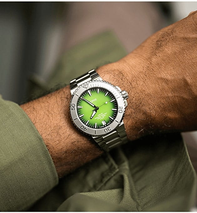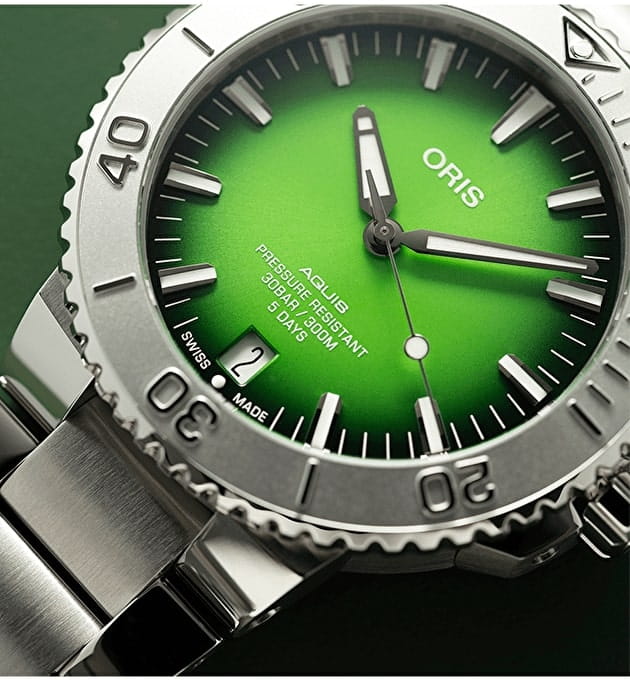 Ограниченная серия Payoon создана на базе Oris Aquis Date Calibre 400 и выпущена ограниченной серией из 250 экземпляров. Она имеет зеленый циферблат, напоминающий цвет воды острова Ко Либонг, серый рельефный безель, напоминающий цвет кожи дюгоней, и гравировку с изображением дюгоня и его детеныша на задней крышке.