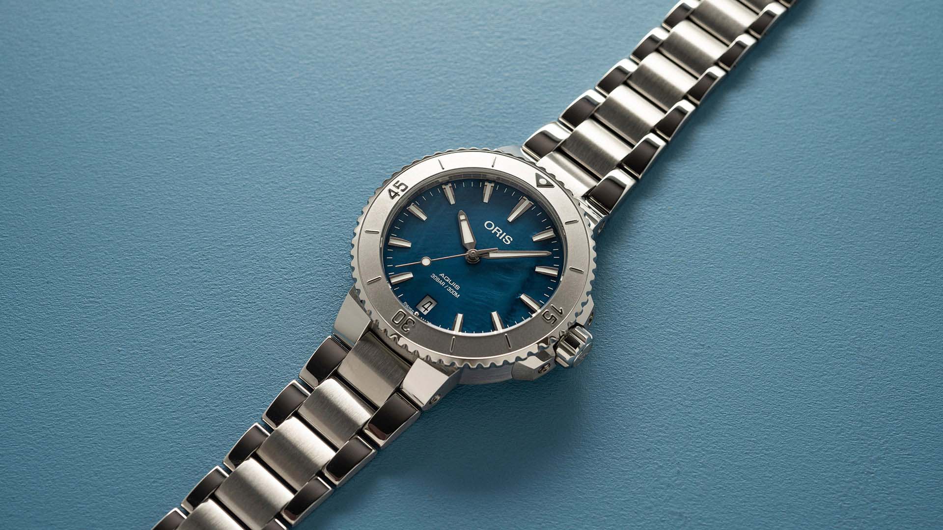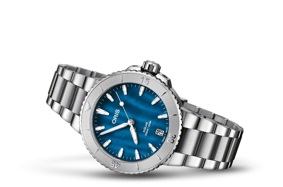 Дайверские часы Aquis Date синего эгейского цвета выделяются контрастным циферблатом. Изготовленный из перламутра, циферблат переливается, как вода на закате, придавая элегантность высокопроизводительным часам. Эти часы с коническим силуэтом являются запоминающимся элементом коллекции Aquis.