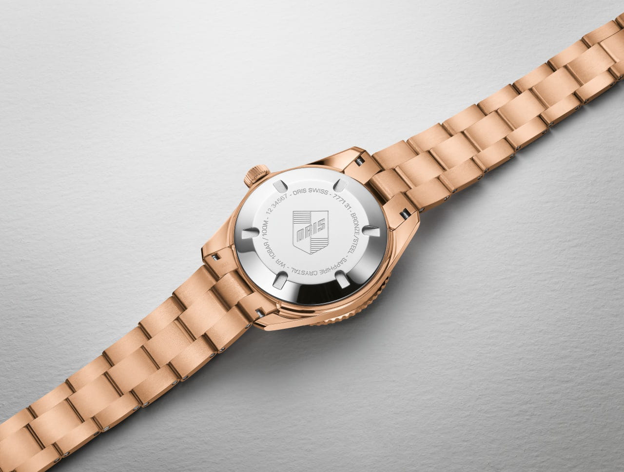 Многокомпонентный бронзовый корпус, бронзовый вращающийся безельБезельВнешний ободок, закрепляющий стекло. В спортивных часах так называется поворотное кольцо с делениями на циферблате, выполняет роль таймера – замеряет отрезки времени на шкале. Неподвижный безель – элемент декора. Однонаправленно вращающийся безель на дайверских часах позволяет фиксировать моменты погружения и выныривания на поверхность. с минутной шкалой. Сапфировое стеклоСапфировое стеклоПрочный и надёжный материал из кристалла сапфира синтетического происхождения, характеризующийся особой твёрдостью и устойчивостью к царапинам и повреждениям., выпуклое с обеих сторон, внутреннее антибликовое покрытие. Прозрачная задняя крышка из сапфирового стеклаСапфировое стеклоПрочный и надёжный материал из кристалла сапфира синтетического происхождения, характеризующийся особой твёрдостью и устойчивостью к царапинам и повреждениям.. Стрелки и метки с люминесцентным покрытиемЛюминесцентное покрытиеПозволяет считывать показания времени в темноте. Производители наносят на стрелки, часовые индексы, безель или поверхность циферблата светонакопительный состав, дающий холодное свечение.. Завинчивающаяся заводная головка.