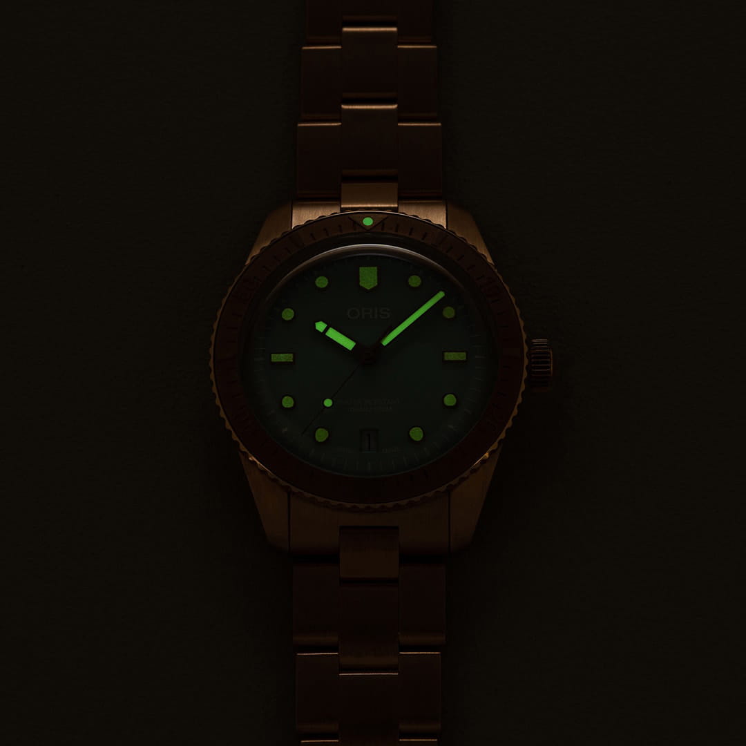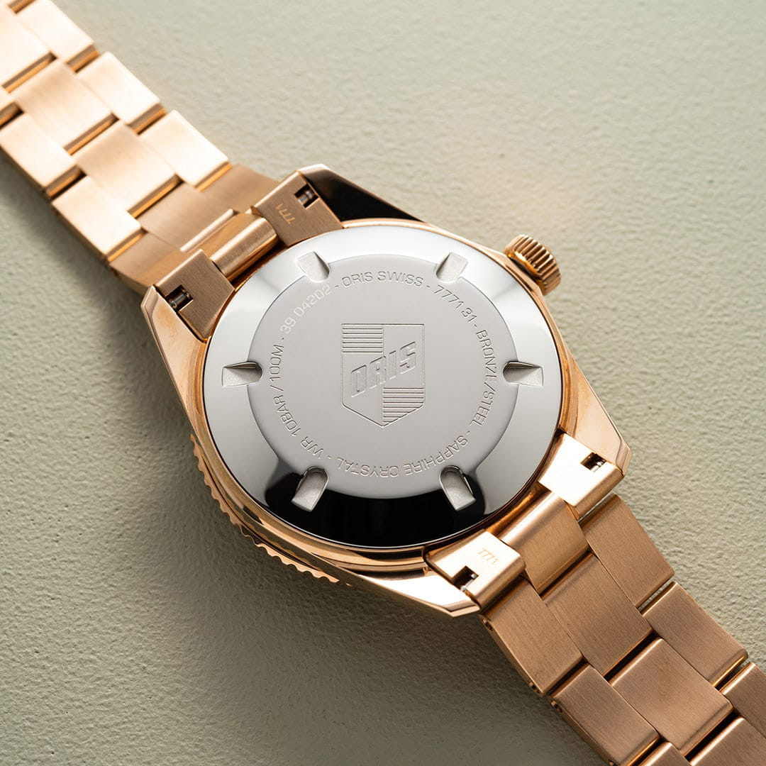 Многокомпонентный бронзовый корпус, бронзовый вращающийся безельБезельВнешний ободок, закрепляющий стекло. В спортивных часах так называется поворотное кольцо с делениями на циферблате, выполняет роль таймера – замеряет отрезки времени на шкале. Неподвижный безель – элемент декора. Однонаправленно вращающийся безель на дайверских часах позволяет фиксировать моменты погружения и выныривания на поверхность. с минутной шкалой. Сапфировое стеклоСапфировое стеклоПрочный и надёжный материал из кристалла сапфира синтетического происхождения, характеризующийся особой твёрдостью и устойчивостью к царапинам и повреждениям., выпуклое с обеих сторон, внутреннее антибликовое покрытие. Прозрачная задняя крышка из сапфирового стеклаСапфировое стеклоПрочный и надёжный материал из кристалла сапфира синтетического происхождения, характеризующийся особой твёрдостью и устойчивостью к царапинам и повреждениям.. Стрелки и метки с люминесцентным покрытиемЛюминесцентное покрытиеПозволяет считывать показания времени в темноте. Производители наносят на стрелки, часовые индексы, безель или поверхность циферблата светонакопительный состав, дающий холодное свечение.. Завинчивающаяся заводная головка.