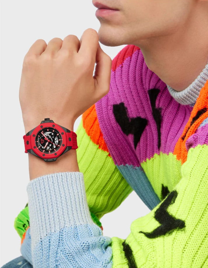 Эти бесподобные часы в стильном дизайне с точным и надежным механизмом завораживают своим корпусом геометричной формы и культовыми элементами бренда и без сомнений сделают мужской образ еще более харизматичным и брутальным. Скелетонизированные мужские механические часы с автоподзаводом. Необычный стальной корпус c частично сатинированной и полированной поверхностью. Циферблат декорирован логотипом бренда в положении 12 часов и изображением черепа с костями. Метки в виде штрихов. Минеральное стеклоМинеральное стеклоМинеральное стекло представляет собой искусственно выращенный минерал кварца. Такое стекло отличается особой устойчивостью к повреждениям и царапинам. Уступает по некоторым качествам сапфировому стеклу. устойчивое к мелким механическим повреждениям. Стрелки и метки с люминесцентным покрытиемЛюминесцентное покрытиеПозволяет считывать показания времени в темноте. Производители наносят на стрелки, часовые индексы, безель или поверхность циферблата светонакопительный состав, дающий холодное свечение.. Граненая заводная головка. Неподвижный безельБезельВнешний ободок, закрепляющий стекло. В спортивных часах так называется поворотное кольцо с делениями на циферблате, выполняет роль таймера – замеряет отрезки времени на шкале. Неподвижный безель – элемент декора. Однонаправленно вращающийся безель на дайверских часах позволяет фиксировать моменты погружения и выныривания на поверхность. из нержавеющей стали с IP-покрытиемIP-покрытиеМетод ионного напыления. Демонстрирует повышенную устойчивость к истиранию, окислению и химическим веществам. Под воздействием высокого давления и температуры около 1500°C молекулы металла надёжно соединяются с частицами корпуса часов.. На задней крышке имеется прозрачное окошко, через которое можно наблюдать работу механизма часов. Черный перфорированный силиконовый ремешок с классической застежкой и шестиугольным логотипом бренда. Фирменная дизайнерская упаковка.