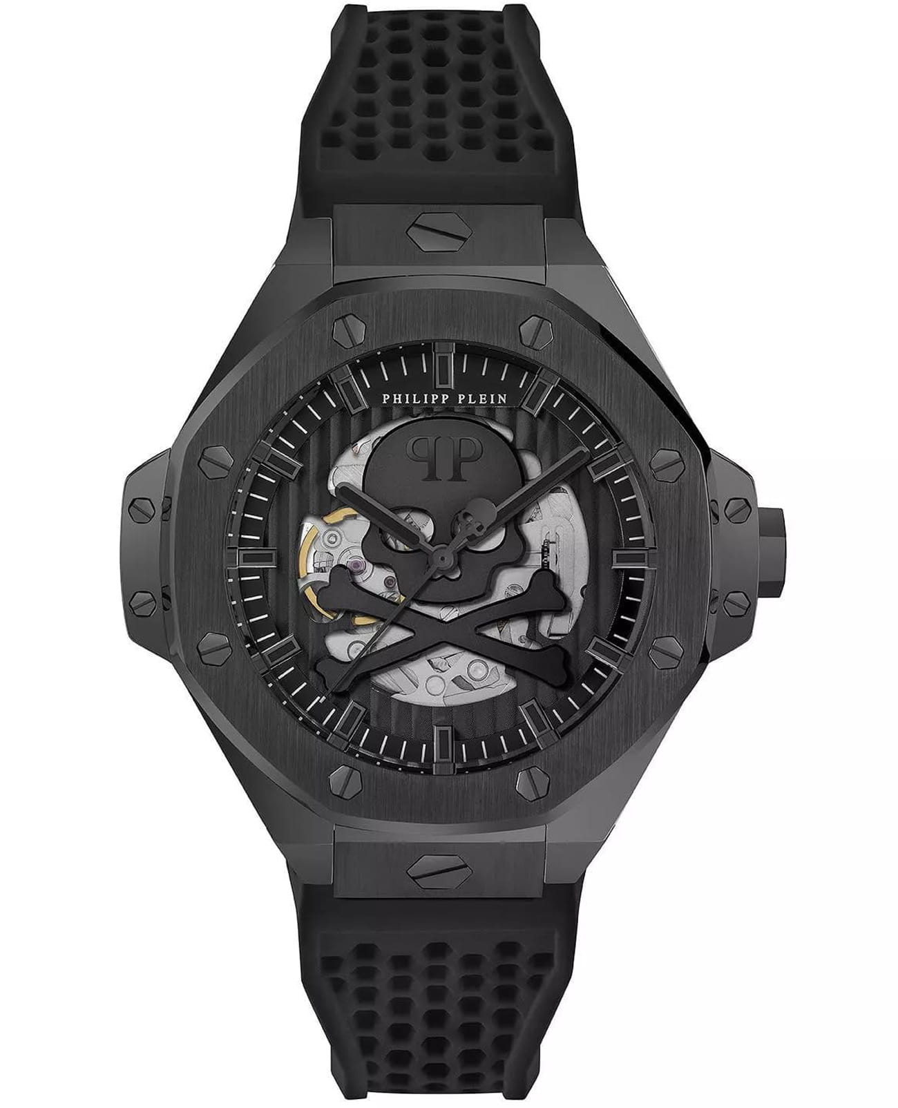 Эти бесподобные часы в стильном дизайне с точным и надежным механизмом завораживают своим корпусом геометричной формы и культовыми элементами бренда и без сомнений сделают мужской образ еще более харизматичным и брутальным. Скелетонизированные мужские механические часы с автоподзаводом. Необычный стальной корпус с IP-покрытиемIP-покрытиеМетод ионного напыления. Демонстрирует повышенную устойчивость к истиранию, окислению и химическим веществам. Под воздействием высокого давления и температуры около 1500°C молекулы металла надёжно соединяются с частицами корпуса часов.. Циферблат декорирован логотипом бренда в положении 12 часов и изображением черепа с костями. Метки в виде штрихов. Минеральное стеклоМинеральное стеклоМинеральное стекло представляет собой искусственно выращенный минерал кварца. Такое стекло отличается особой устойчивостью к повреждениям и царапинам. Уступает по некоторым качествам сапфировому стеклу. устойчивое к мелким механическим повреждениям. Стрелки и метки с люминесцентным покрытиемЛюминесцентное покрытиеПозволяет считывать показания времени в темноте. Производители наносят на стрелки, часовые индексы, безель или поверхность циферблата светонакопительный состав, дающий холодное свечение.. Граненая заводная головка. На задней крышке имеется прозрачное окошко, через которое можно наблюдать работу механизма часов. Черный перфорированный силиконовый ремешок с классической застежкой и шестиугольным логотипом бренда. Фирменная дизайнерская упаковка.