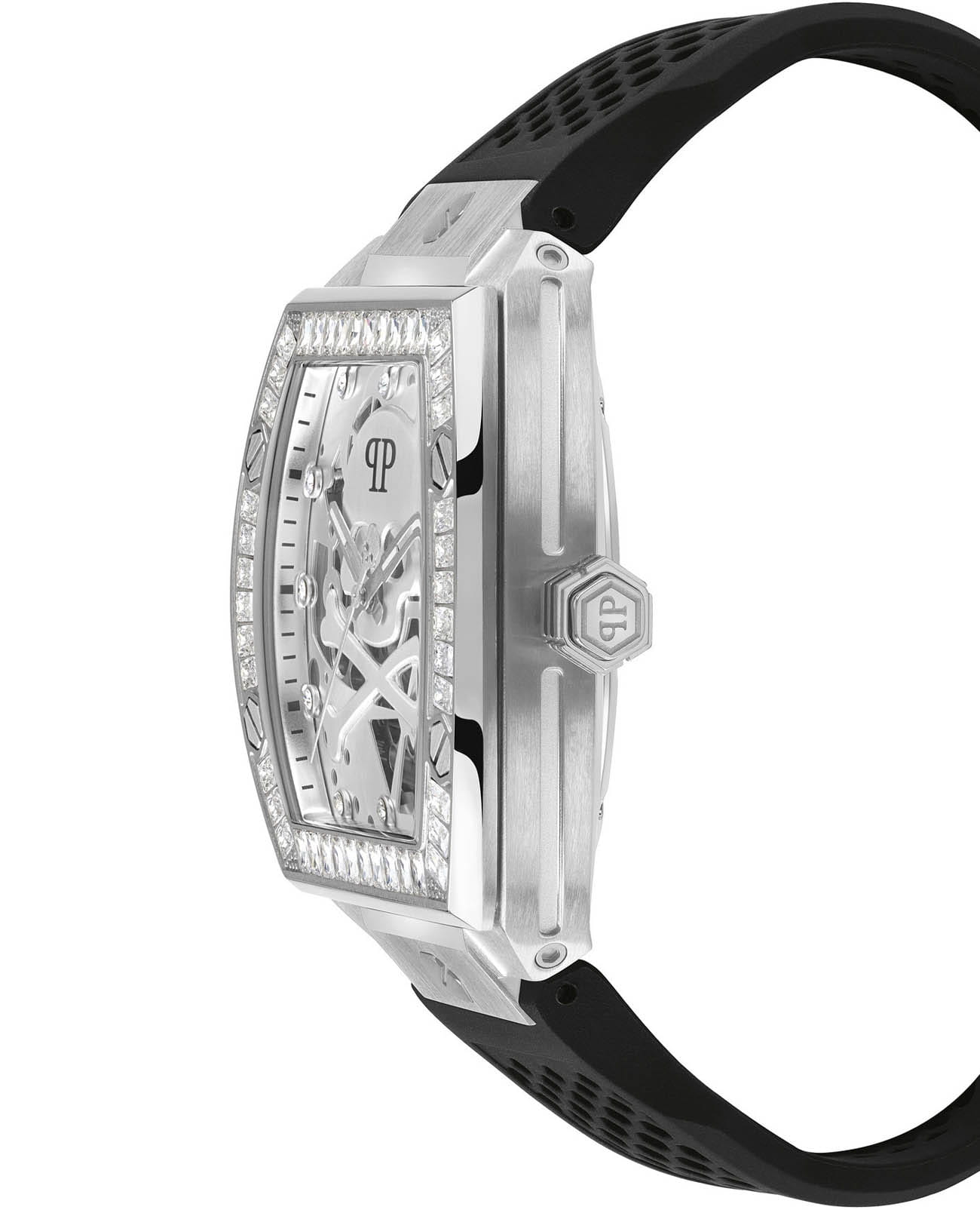 Мужские механические часы-скелетоны Philipp Plein The Skeleton PWBAA1323. Корпус часов изготовлен из нержавеющей стали. Минеральное стеклоМинеральное стеклоМинеральное стекло представляет собой искусственно выращенный минерал кварца. Такое стекло отличается особой устойчивостью к повреждениям и царапинам. Уступает по некоторым качествам сапфировому стеклу. устойчивое к мелким механическим повреждениям. Влагозащита: 50 метров, позволит защитить корпус от случайных брызг или капель дождя. Стрелки с люминесцентным покрытиемЛюминесцентное покрытиеПозволяет считывать показания времени в темноте. Производители наносят на стрелки, часовые индексы, безель или поверхность циферблата светонакопительный состав, дающий холодное свечение.. Практичный ремешок из силикона на стандартной застёжке. БезельБезельВнешний ободок, закрепляющий стекло. В спортивных часах так называется поворотное кольцо с делениями на циферблате, выполняет роль таймера – замеряет отрезки времени на шкале. Неподвижный безель – элемент декора. Однонаправленно вращающийся безель на дайверских часах позволяет фиксировать моменты погружения и выныривания на поверхность. и циферблат инкрустированы кристаллами Preciosa.