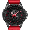 Эти необычные часы, воплощающие в себе уникальное сочетание узнаваемости бренда и непредсказуемости, каждый день будут напоминать вам о том, что нет таких целей, которых вы не смогли бы достичь. Мужские часы с японским кварцевым механизмом. Стальной корпус с чёрным IP-покрытиемIP-покрытиеМетод ионного напыления. Демонстрирует повышенную устойчивость к истиранию, окислению и химическим веществам. Под воздействием высокого давления и температуры около 1500°C молекулы металла надёжно соединяются с частицами корпуса часов.. БезельБезельВнешний ободок, закрепляющий стекло. В спортивных часах так называется поворотное кольцо с делениями на циферблате, выполняет роль таймера – замеряет отрезки времени на шкале. Неподвижный безель – элемент декора. Однонаправленно вращающийся безель на дайверских часах позволяет фиксировать моменты погружения и выныривания на поверхность. украшен шестиугольными логотипами бренда, расположенными симметрично слева и справа, сверху украшен символичным логотипом Philipp Plein, а снизу украшен названием коллекции ''The Skull''. Метки в виде штрихов. Высокопрочное минеральное стеклоМинеральное стеклоМинеральное стекло представляет собой искусственно выращенный минерал кварца. Такое стекло отличается особой устойчивостью к повреждениям и царапинам. Уступает по некоторым качествам сапфировому стеклу.. Граненая заводная головка с защитой. Красный силиконовый ремешок с классической застежкой украшен объемным черепом и стальной вставкой. Фирменная дизайнерская упаковка.
