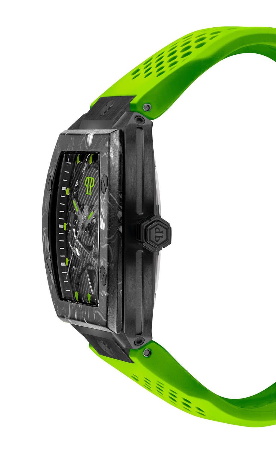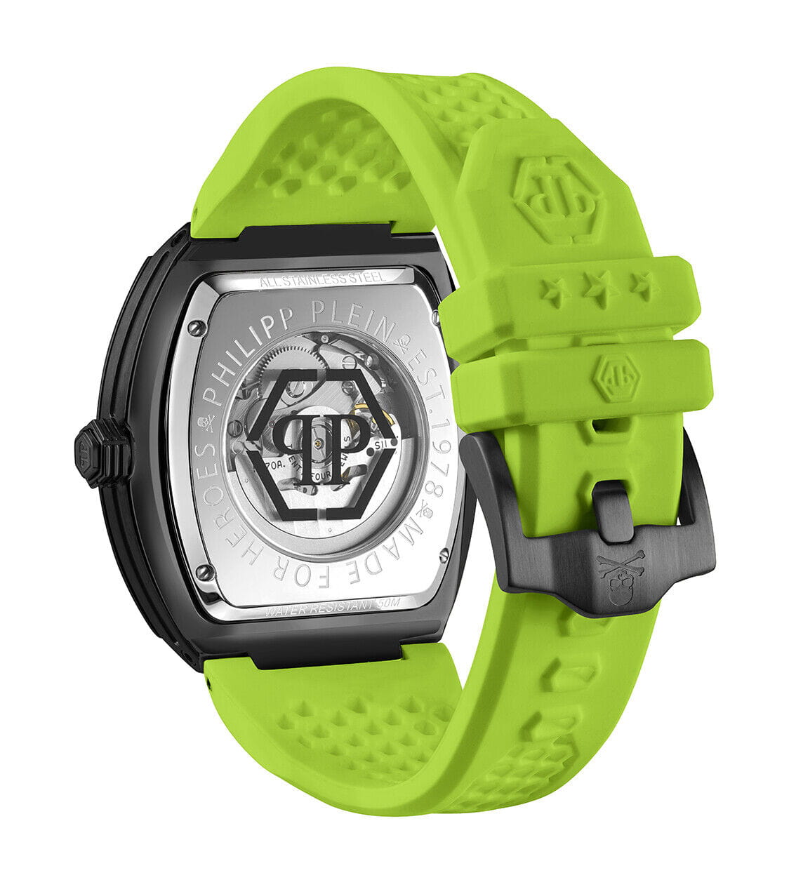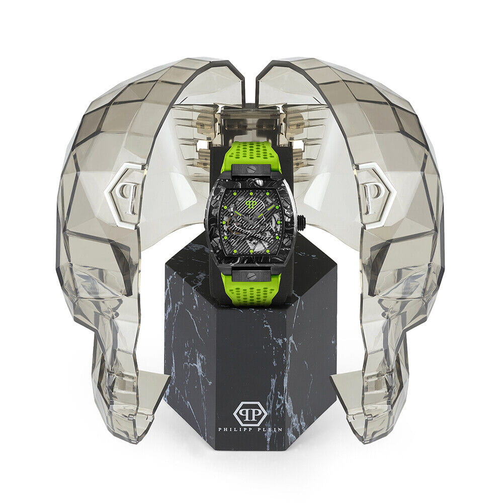 Яркие мужские часы с минеральным стекломМинеральное стеклоМинеральное стекло представляет собой искусственно выращенный минерал кварца. Такое стекло отличается особой устойчивостью к повреждениям и царапинам. Уступает по некоторым качествам сапфировому стеклу. Philipp Plein The Skeleton PWBAA0822, кварцевый механизм с высокой точностью. Класс водозащиты: 50 метров, позволит защитить корпус от случайных брызг или капель дождя. Корпус часов изготовлен из стали с IP-покрытиемIP-покрытиеМетод ионного напыления. Демонстрирует повышенную устойчивость к истиранию, окислению и химическим веществам. Под воздействием высокого давления и температуры около 1500°C молекулы металла надёжно соединяются с частицами корпуса часов..