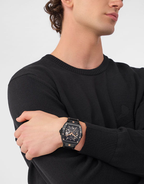 Philipp Plein The $keleton 2.0 PWJFA0725 - это дерзкие и бескомпромиссные часы, воплощающие бунтарский дух бренда. Их отличает узнаваемый мотив черепа, ставший визитной карточкой Philipp Plein, искусно интегрированный в дизайн циферблата. Скелетонизированные мужские механические часы с автоподзаводом. Бочкообразный стальной корпус диаметром 44 мм с PVD-покрытиемPVDУльтратонкое покрытие наносится в технике вакуумного напыления, сочетает в себе нитрид титана особой прочности со слоем золота или оксида хрома. Несёт в себе декоративную или защитную функцию.. Стальной браслет на застёжке-бабочке с кнопкамиЗастёжка "бабочка"Такой вид застёжки дополняется предохранителями, помогающими избежать случайного раскрытия браслета. Обладают изящным исполнением. обеспечивает надёжную фиксацию и комфортное ношение. Метки в виде точек. Минеральное стеклоМинеральное стеклоМинеральное стекло представляет собой искусственно выращенный минерал кварца. Такое стекло отличается особой устойчивостью к повреждениям и царапинам. Уступает по некоторым качествам сапфировому стеклу. защищает циферблат от царапин. Люминесцентное покрытиеЛюминесцентное покрытиеПозволяет считывать показания времени в темноте. Производители наносят на стрелки, часовые индексы, безель или поверхность циферблата светонакопительный состав, дающий холодное свечение. стрелок и меток позволит следить за временем даже в полной темноте. Граненая заводная головка. Влагозащита: 50 метров, позволит защитить корпус от случайных брызг или капель дождя. Идеальный аксессуар для тех, кто ценит индивидуальность и не боится выделяться из толпы.