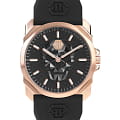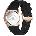 Мужские кварцевые часы с фирменным изображением черепа Philipp Plein The Skull King PWLAA0222, кварцевый механизм с высокой точностью. Класс водозащиты: 50 метров, позволит защитить корпус от случайных брызг или капель дождя. Корпус часов изготовлен из стали с IP-покрытиемIP-покрытиеМетод ионного напыления. Демонстрирует повышенную устойчивость к истиранию, окислению и химическим веществам. Под воздействием высокого давления и температуры около 1500°C молекулы металла надёжно соединяются с частицами корпуса часов. цвета розовое золото. Черный силиконовый ремешок шириной 26 мм, стандартная застежка. Прочное минеральное стеклоМинеральное стеклоМинеральное стекло представляет собой искусственно выращенный минерал кварца. Такое стекло отличается особой устойчивостью к повреждениям и царапинам. Уступает по некоторым качествам сапфировому стеклу. устойчивое к мелким механическим повреждениям.