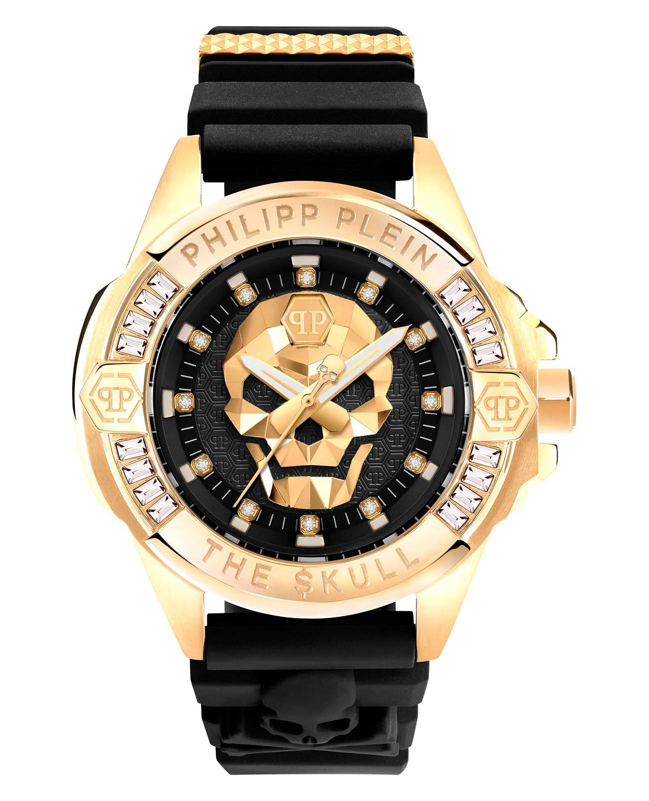 Яркие унисекс часы с минеральным стекломМинеральное стеклоМинеральное стекло представляет собой искусственно выращенный минерал кварца. Такое стекло отличается особой устойчивостью к повреждениям и царапинам. Уступает по некоторым качествам сапфировому стеклу. Philipp Plein The Skull PWNAA0122, кварцевый механизм с высокой точностью. Класс водозащиты: 50 метров, позволит защитить корпус от случайных брызг или капель дождя. Корпус часов изготовлен из стали с IP-покрытиемIP-покрытиеМетод ионного напыления. Демонстрирует повышенную устойчивость к истиранию, окислению и химическим веществам. Под воздействием высокого давления и температуры около 1500°C молекулы металла надёжно соединяются с частицами корпуса часов.. Круглый стальной корпус украшен кристаллами Swarovski. Циферблат с метками в виде точек украшенных кристаллами Swarovski, дополнен трехмерным граненым черепом. Шестигранная заводная головка с защитой. Силиконовый ремешок украшен объемным черепом и стальной вставкой.