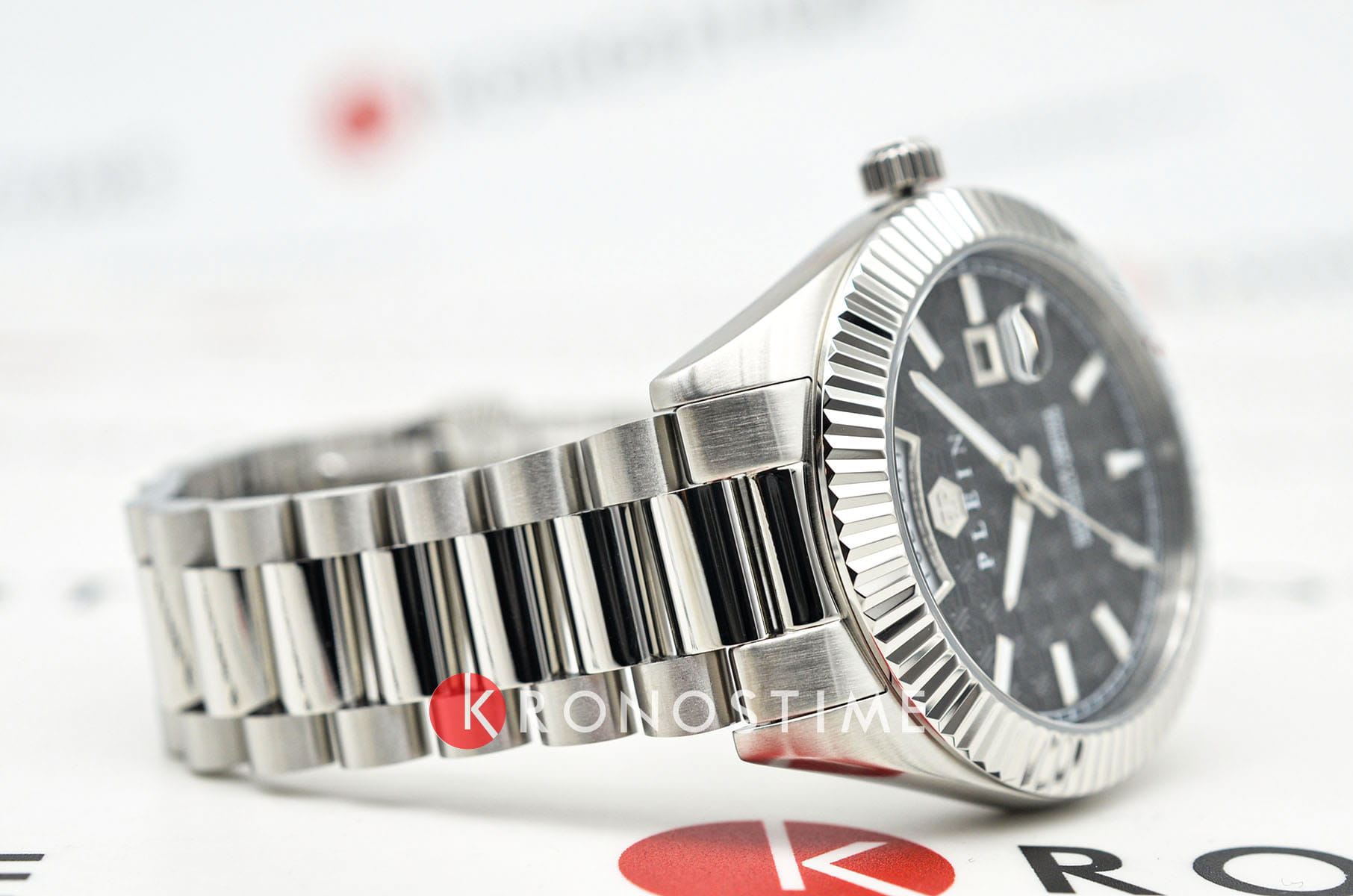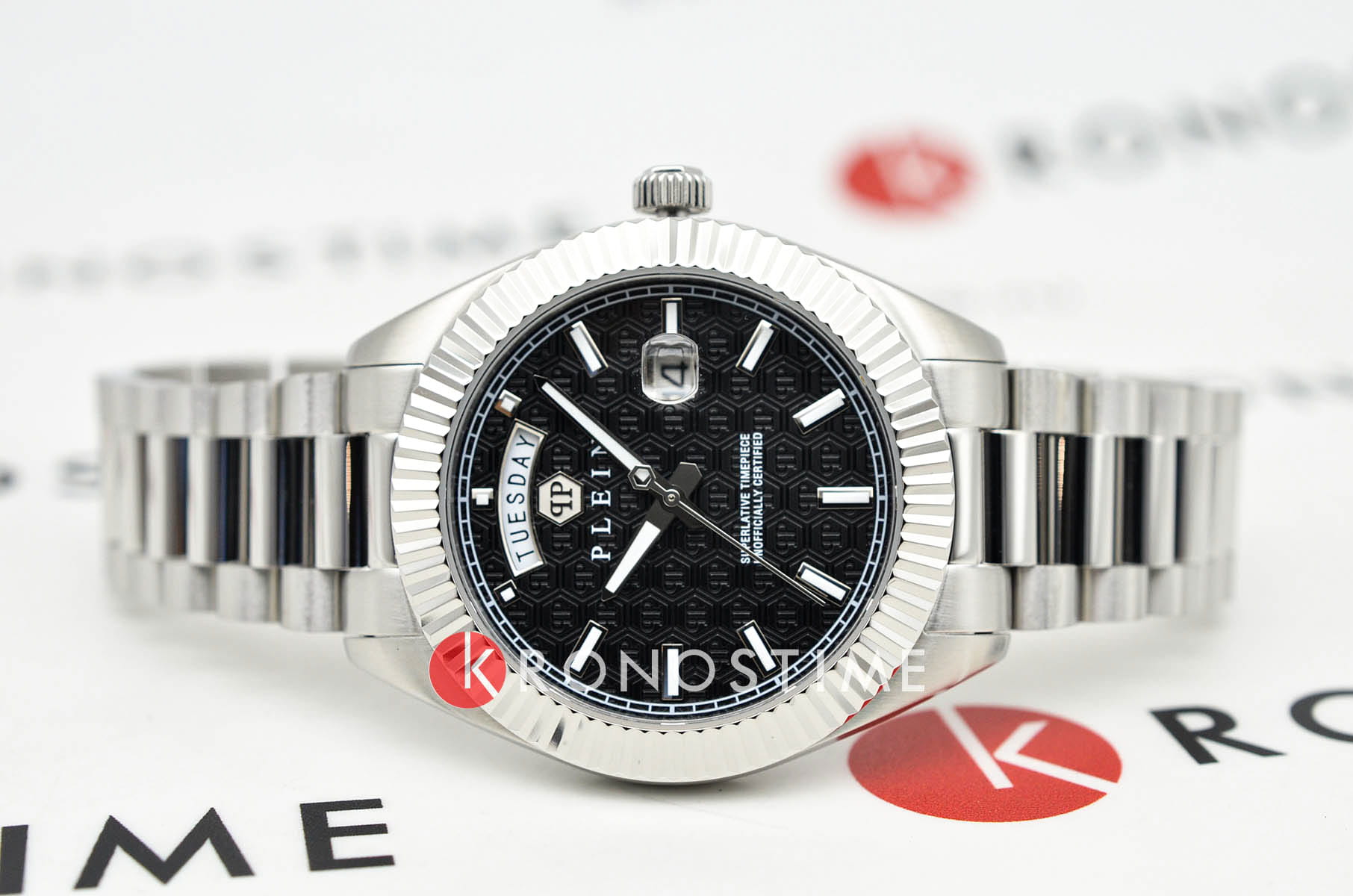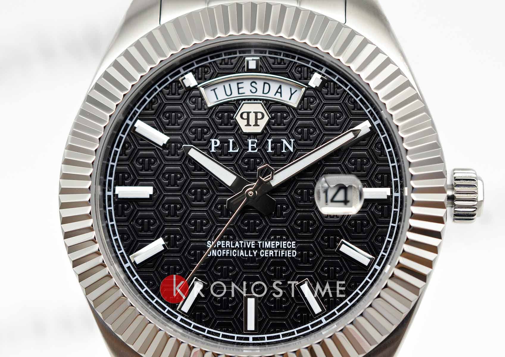 Мужские кварцевые часы Philipp Plein Date Superlative Gent PWPNA0824, кварцевый механизм с высокой точностью. Класс водозащиты: 50 метров, позволит защитить корпус от случайных брызг или капель дождя. Корпус и браслет часов изготовлены из стали. Прочное минеральное стеклоМинеральное стеклоМинеральное стекло представляет собой искусственно выращенный минерал кварца. Такое стекло отличается особой устойчивостью к повреждениям и царапинам. Уступает по некоторым качествам сапфировому стеклу. устойчивое к мелким механическим повреждениям. Браслет дополняет застёжка-бабочка с кнопкамиЗастёжка "бабочка"Такой вид застёжки дополняется предохранителями, помогающими избежать случайного раскрытия браслета. Обладают изящным исполнением. .