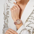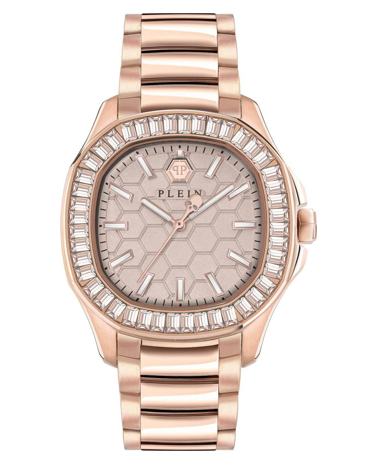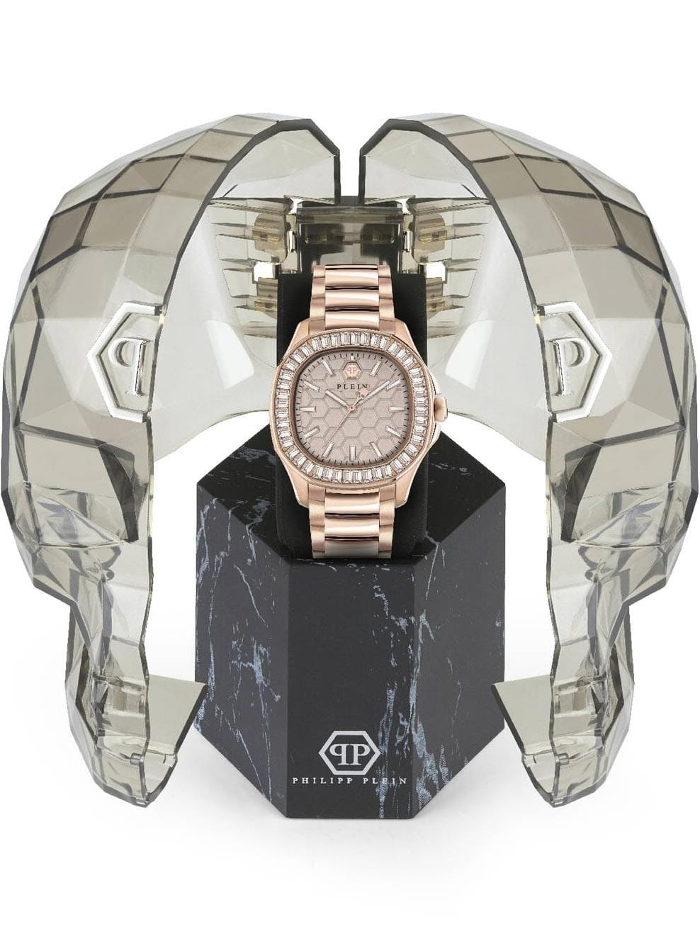 Яркие женские часы с минеральным стекломМинеральное стеклоМинеральное стекло представляет собой искусственно выращенный минерал кварца. Такое стекло отличается особой устойчивостью к повреждениям и царапинам. Уступает по некоторым качествам сапфировому стеклу. Philipp Plein PWTAA0723, кварцевый механизм с высокой точностью. Класс водозащиты: 50 метров, позволит защитить корпус от случайных брызг или капель дождя. Корпус часов изготовлен из стали с IP-покрытиемIP-покрытиеМетод ионного напыления. Демонстрирует повышенную устойчивость к истиранию, окислению и химическим веществам. Под воздействием высокого давления и температуры около 1500°C молекулы металла надёжно соединяются с частицами корпуса часов.. Стрелки и метки с люминесцентным покрытиемЛюминесцентное покрытиеПозволяет считывать показания времени в темноте. Производители наносят на стрелки, часовые индексы, безель или поверхность циферблата светонакопительный состав, дающий холодное свечение.. Стальной корпус с геометричным безелем, инкрустированным кристаллами. Застёжка бабочка с кнопкамиЗастёжка "бабочка"Такой вид застёжки дополняется предохранителями, помогающими избежать случайного раскрытия браслета. Обладают изящным исполнением.