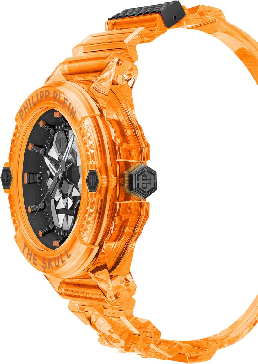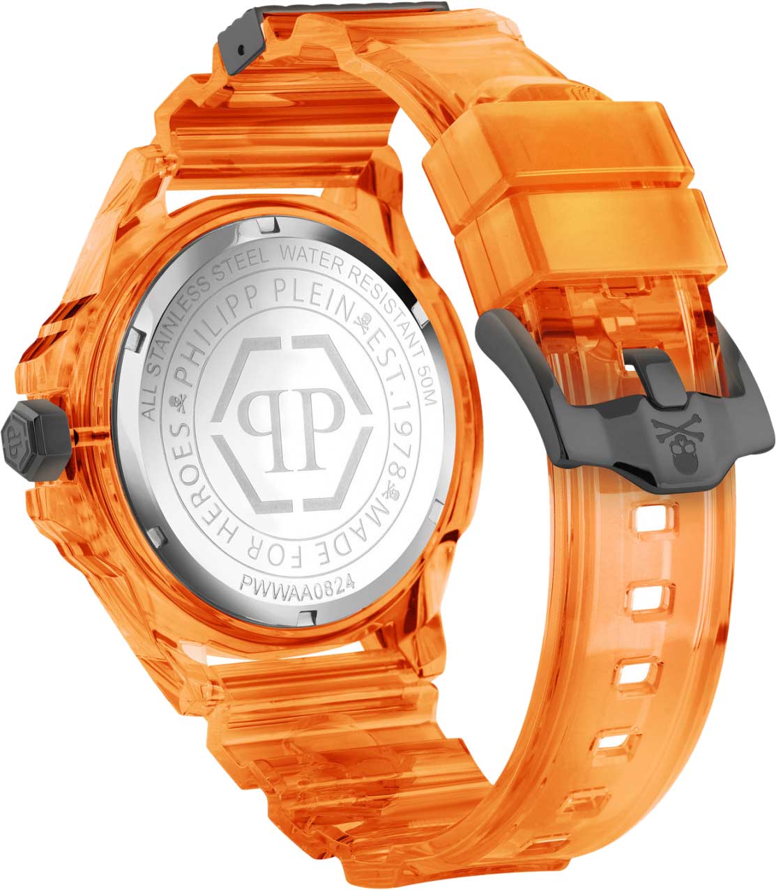 Модель Philipp Plein PWWAA0824 The $kull Scuba Duba Edition — это яркий и дерзкий аксессуар, сочетающий в себе современный дизайн и функциональность. Корпус диаметром 44 мм выполнен из прочной пластмассы оранжевого цвета, подчёркивая уникальность и стиль модели. Чёрный гильошированный циферблат с фирменным черепом Philipp Plein придаёт часам характерный вид. Часы оснащены кварцевым механизмом, обеспечивающим точный ход. Циферблат защищён минеральным стекломМинеральное стеклоМинеральное стекло представляет собой искусственно выращенный минерал кварца. Такое стекло отличается особой устойчивостью к повреждениям и царапинам. Уступает по некоторым качествам сапфировому стеклу., устойчивым к царапинам. Установлена классическая застёжка-пряжка, обеспечивая надёжную фиксацию на запястье. Модель обладает водонепроницаемостью до 5 ATM, что делает её подходящей для повседневного использования. Philipp Plein — это не просто часы, а выражение индивидуальности и стиля, идеально подходящее для тех, кто стремится выделиться из толпы.