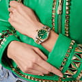 Яркие женские часы Philipp Plein Date Superlative PWYAA0523 c с минеральным стекломМинеральное стеклоМинеральное стекло представляет собой искусственно выращенный минерал кварца. Такое стекло отличается особой устойчивостью к повреждениям и царапинам. Уступает по некоторым качествам сапфировому стеклу.. Особенные часы для особенных женщин! Ослепительный аксессуар, демонстрирующий роскошь и изысканность.Часы с круглым стальным корпусом с IP-покрытиемIP-покрытиеМетод ионного напыления. Демонстрирует повышенную устойчивость к истиранию, окислению и химическим веществам. Под воздействием высокого давления и температуры около 1500°C молекулы металла надёжно соединяются с частицами корпуса часов.. Перламутровый циферблат с метками в виде точек, украшенных кристаллами. Люминесцентное покрытиеЛюминесцентное покрытиеПозволяет считывать показания времени в темноте. Производители наносят на стрелки, часовые индексы, безель или поверхность циферблата светонакопительный состав, дающий холодное свечение. стрелок. Окошко даты с увеличительным стеклом находится в положении 3 часа. Рифленая заводная головка. Стальной браслет на застёжке бабочка с кнопкамиЗастёжка "бабочка"Такой вид застёжки дополняется предохранителями, помогающими избежать случайного раскрытия браслета. Обладают изящным исполнением.