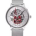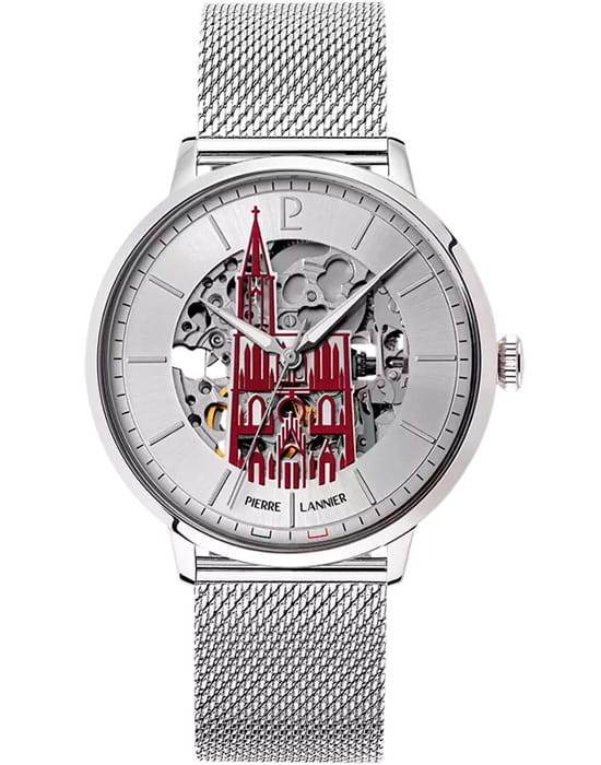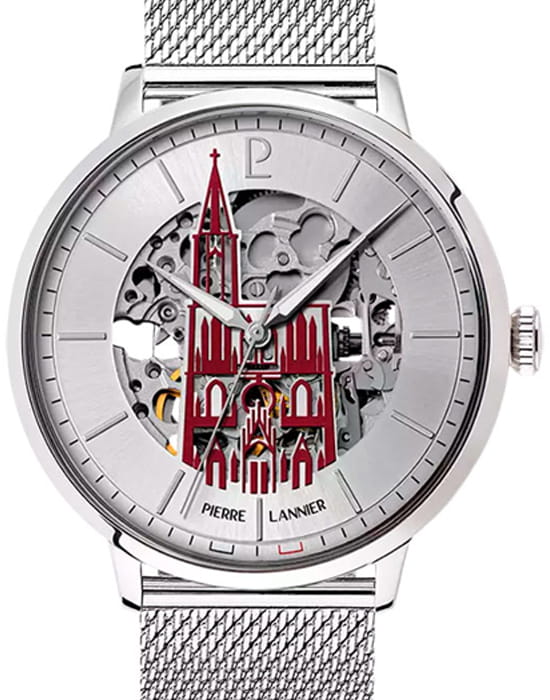 Мужские механические часы с автоподзаводом Pierre Lannier 301F121 — французское мастерство и архитектурная элегантность в скелетонизированном исполнении. Корпус из нержавеющей стали, диаметром 42 мм. Циферблат — серебристый скелетонизированный с изображением кафедрального собора. Стрелки с люминесцентным покрытиемЛюминесцентное покрытиеПозволяет считывать показания времени в темноте. Производители наносят на стрелки, часовые индексы, безель или поверхность циферблата светонакопительный состав, дающий холодное свечение.. Стекло — минеральноеМинеральное стеклоМинеральное стекло представляет собой искусственно выращенный минерал кварца. Такое стекло отличается особой устойчивостью к повреждениям и царапинам. Уступает по некоторым качествам сапфировому стеклу., устойчивое к мелким повреждениям. Стальной браслет миланского плетения на раскладном замкеРаскладной замокДанный вариант застежки используется только на часах с металлическим браслетом. Отличительная особенность такого крепления в том, что длина браслета становится универсальной и вы можете самостоятельно отрегулировать нужный вам размер – застежка просто двигается по браслету часов.. Водонепроницаемость 50 м. Идеальный выбор для тех, кто ценит французский дизайн и архитектурное вдохновение.