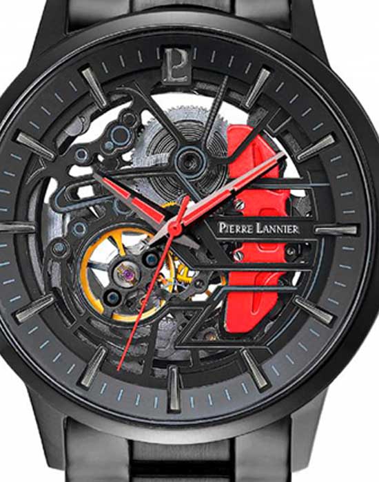 Pierre Lannier Paddock 344A459 — элегантная модель с выразительным спортивным характером. Корпус диаметром 43 мм выполнен из нержавеющей стали с матовым PVD-покрытиемPVDУльтратонкое покрытие наносится в технике вакуумного напыления, сочетает в себе нитрид титана особой прочности со слоем золота или оксида хрома. Несёт в себе декоративную или защитную функцию., подчёркивающим технологичный стиль и динамику дизайна. Циферблат частично скелетонизирован, открывая механизм и баланс, что придаёт модели техническую выразительность. Часовые метки и стрелки покрыты люминесцентным покрытиемЛюминесцентное покрытиеПозволяет считывать показания времени в темноте. Производители наносят на стрелки, часовые индексы, безель или поверхность циферблата светонакопительный состав, дающий холодное свечение., обеспечивая хорошую читаемость в любых условиях. Циферблат защищён прочным минеральным стекломМинеральное стеклоМинеральное стекло представляет собой искусственно выращенный минерал кварца. Такое стекло отличается особой устойчивостью к повреждениям и царапинам. Уступает по некоторым качествам сапфировому стеклу., устойчивым к царапинам и повседневным воздействиям. Водонепроницаемость до 50 метров позволяет использовать часы в различных жизненных ситуациях без ограничений. Внутри — автоматический механизм с автоподзаводом, не требующий подзарядки при регулярном ношении. Стальной браслет с PVD-покрытиемPVDУльтратонкое покрытие наносится в технике вакуумного напыления, сочетает в себе нитрид титана особой прочности со слоем золота или оксида хрома. Несёт в себе декоративную или защитную функцию. на раскладной застёжкеРаскладная застёжкаТакой тип застёжки используется только на браслетах из металла. Она никогда не раскрывается полностью, происходит разделение на 2 и более частей. Раскладывающая застёжка снизит вероятность потери часов к минимуму. обеспечивающей комфорт и надёжную фиксацию. Paddock — гармоничное сочетание механики, изящества и современного дизайна, созданное для тех, кто ценит уверенность и индивидуальность в деталях.
