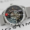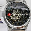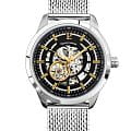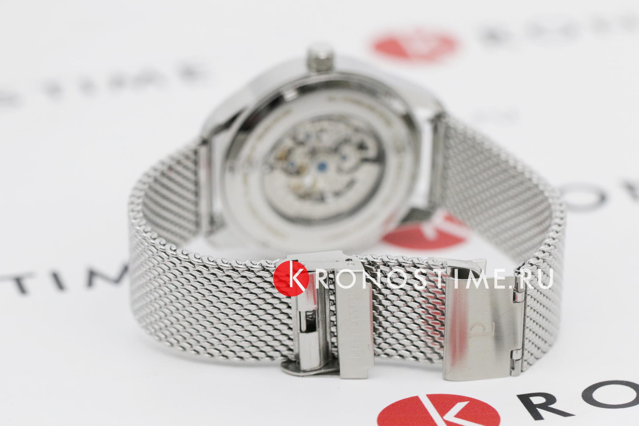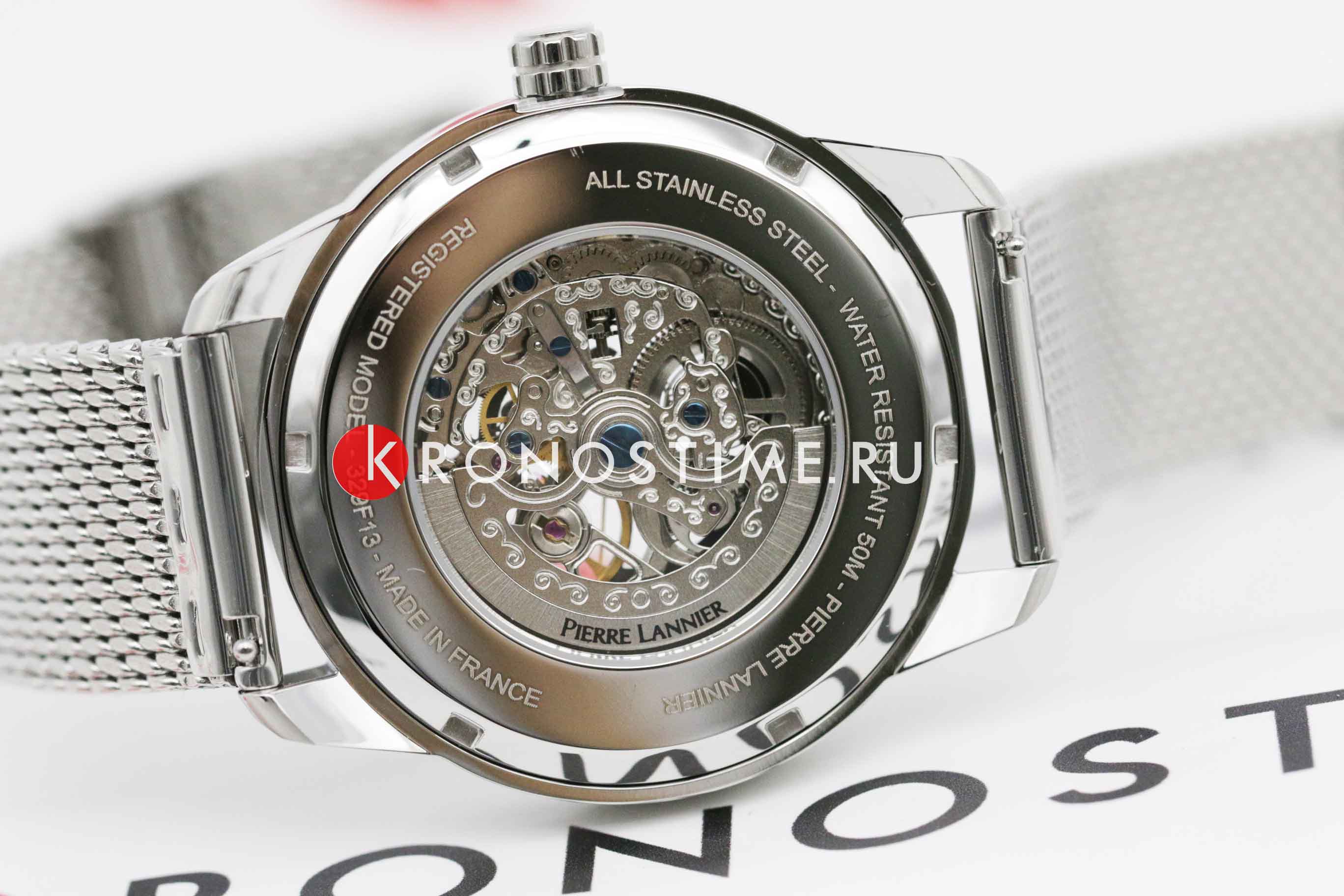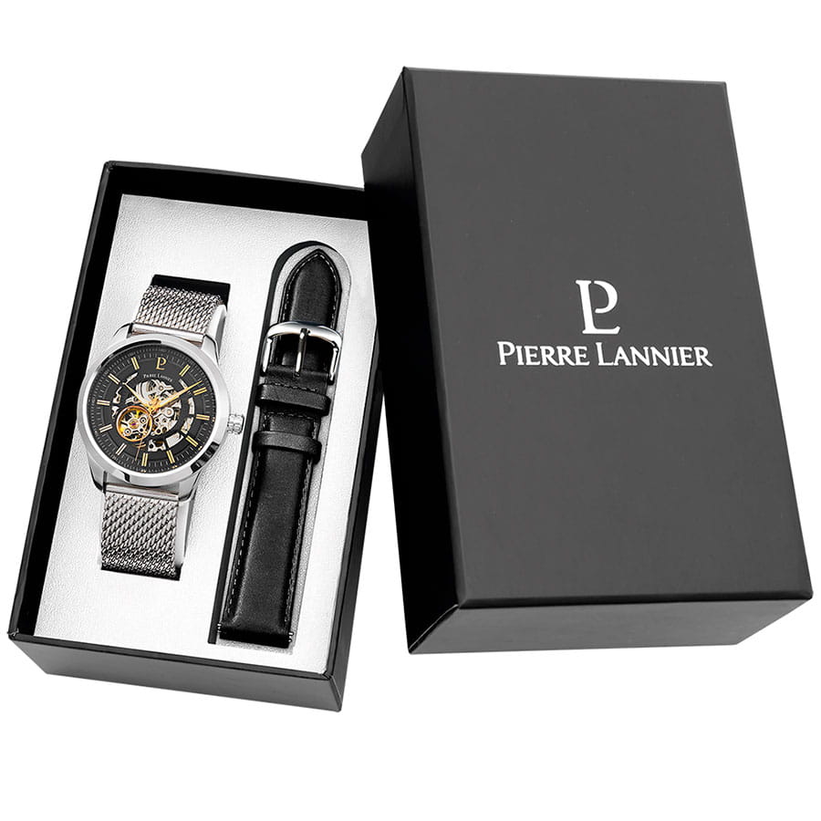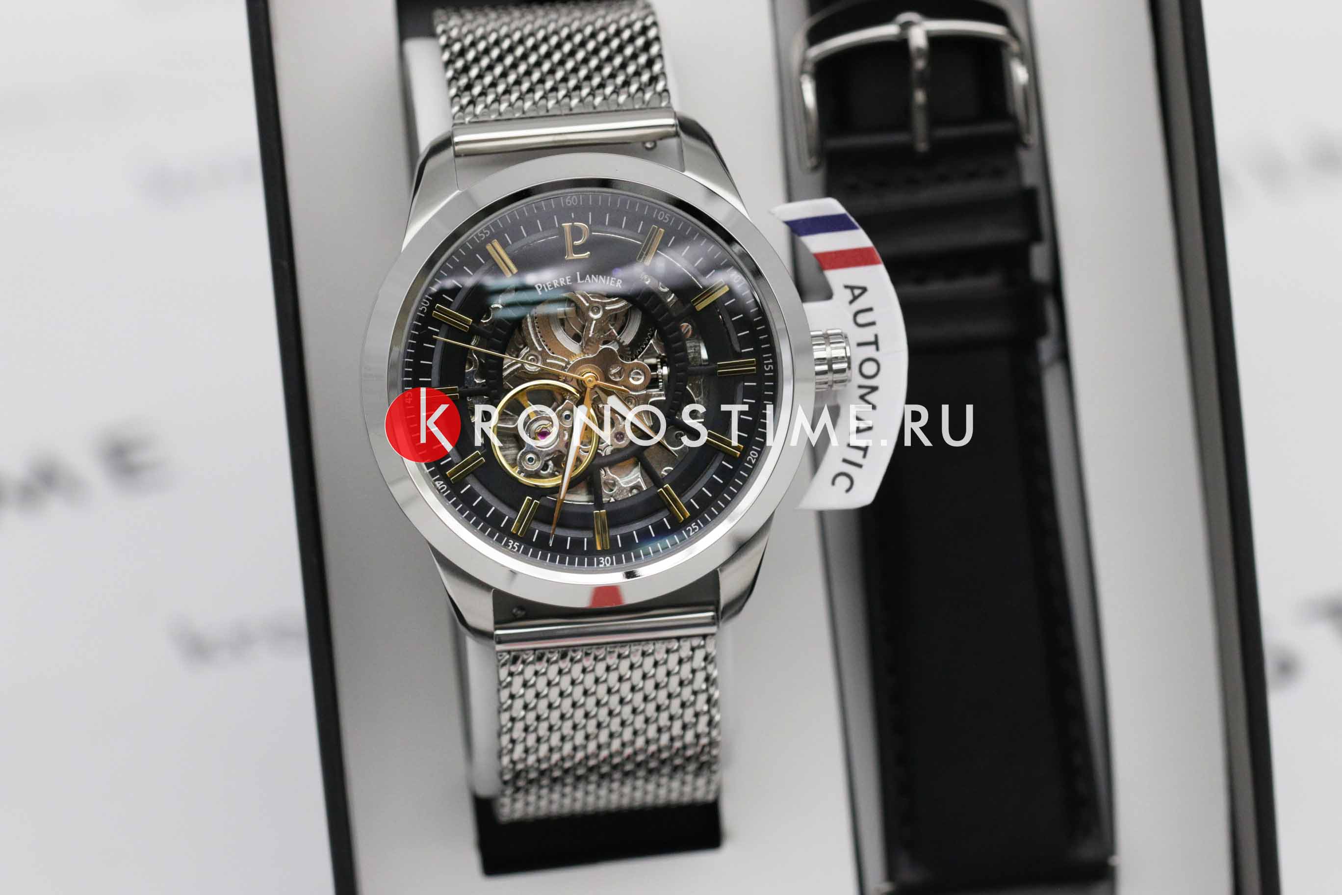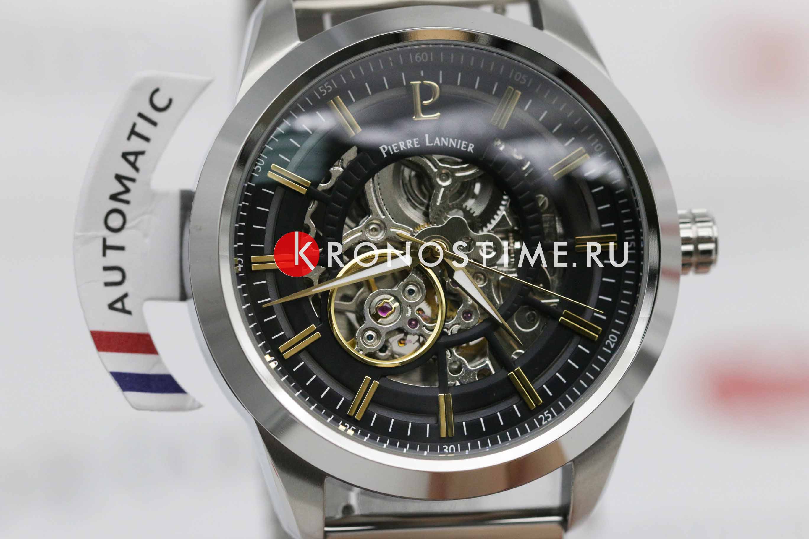 Мужские механические часы с автоподзаводом Pierre Lannier Automatic 374F131. Минеральное стеклоМинеральное стеклоМинеральное стекло представляет собой искусственно выращенный минерал кварца. Такое стекло отличается особой устойчивостью к повреждениям и царапинам. Уступает по некоторым качествам сапфировому стеклу. устойчивое к мелким механическим повреждениям. Центральные часовая, минутная и секундная стрелки. Корпус выполнен из нержавеющей стали. Водостойкость: 50 метров, позволит защитить корпус от случайных брызг или капель дождя. Стальной браслет миланского плетения с раскладной застёжкойРаскладная застёжкаТакой тип застёжки используется только на браслетах из металла. Она никогда не раскрывается полностью, происходит разделение на 2 и более частей. Раскладывающая застёжка снизит вероятность потери часов к минимуму.. Стрелки с люминесцентным покрытиемЛюминесцентное покрытиеПозволяет считывать показания времени в темноте. Производители наносят на стрелки, часовые индексы, безель или поверхность циферблата светонакопительный состав, дающий холодное свечение.. Черный скелетонизированный циферблат. В комплекте черный кожаный ремешок.