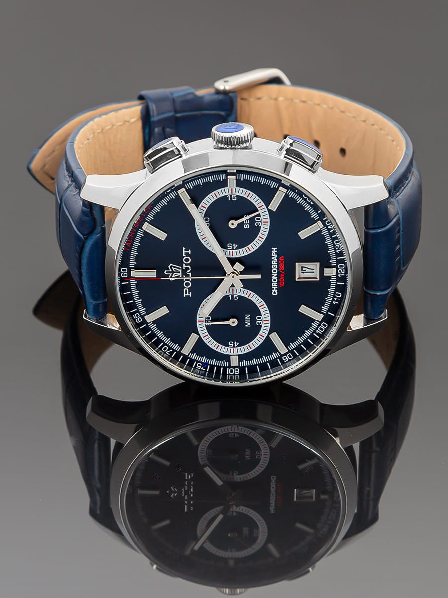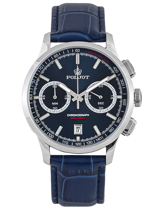 Poljot 6S21.901211 — современные мужские часы с выразительным спортивным дизайном и надёжной функциональностью. Корпус из нержавеющей стали подчёркивает прочность и уверенный характер модели, а глубокий циферблат с счётчиками хронографаХронографФункция позволяет измерять отрезки времени с особой точностью: часы, минуты, секунды. Верным признаком хронографа является наличие на циферблате 3 дополнительных окошек-счётчиков. и аккуратным окном даты на позиции «6 часов» придаёт часам динамичный вид. Контрастные стрелки и метки с люминесцентным покрытиемЛюминесцентное покрытиеПозволяет считывать показания времени в темноте. Производители наносят на стрелки, часовые индексы, безель или поверхность циферблата светонакопительный состав, дающий холодное свечение. обеспечивают удобство считывания информации в любое время суток, а внешняя шкала тахиметраТахиметрРазмеченная шкала, располагается на ободке или безеле часов. Тахиметр позволяет рассчитать скорость на определённом участке пути, расстояние измеряется в километрах или милях. добавляет спортивную функциональность. Прочное минеральное стеклоМинеральное стеклоМинеральное стекло представляет собой искусственно выращенный минерал кварца. Такое стекло отличается особой устойчивостью к повреждениям и царапинам. Уступает по некоторым качествам сапфировому стеклу. защищает циферблат от царапин, а ремешок из натуральной кожи гарантирует комфорт и элегантную посадку на запястье. Poljot — это гармония классики и спортивного духа, созданная для мужчин, ценящих точность, надёжность и уверенный стиль.