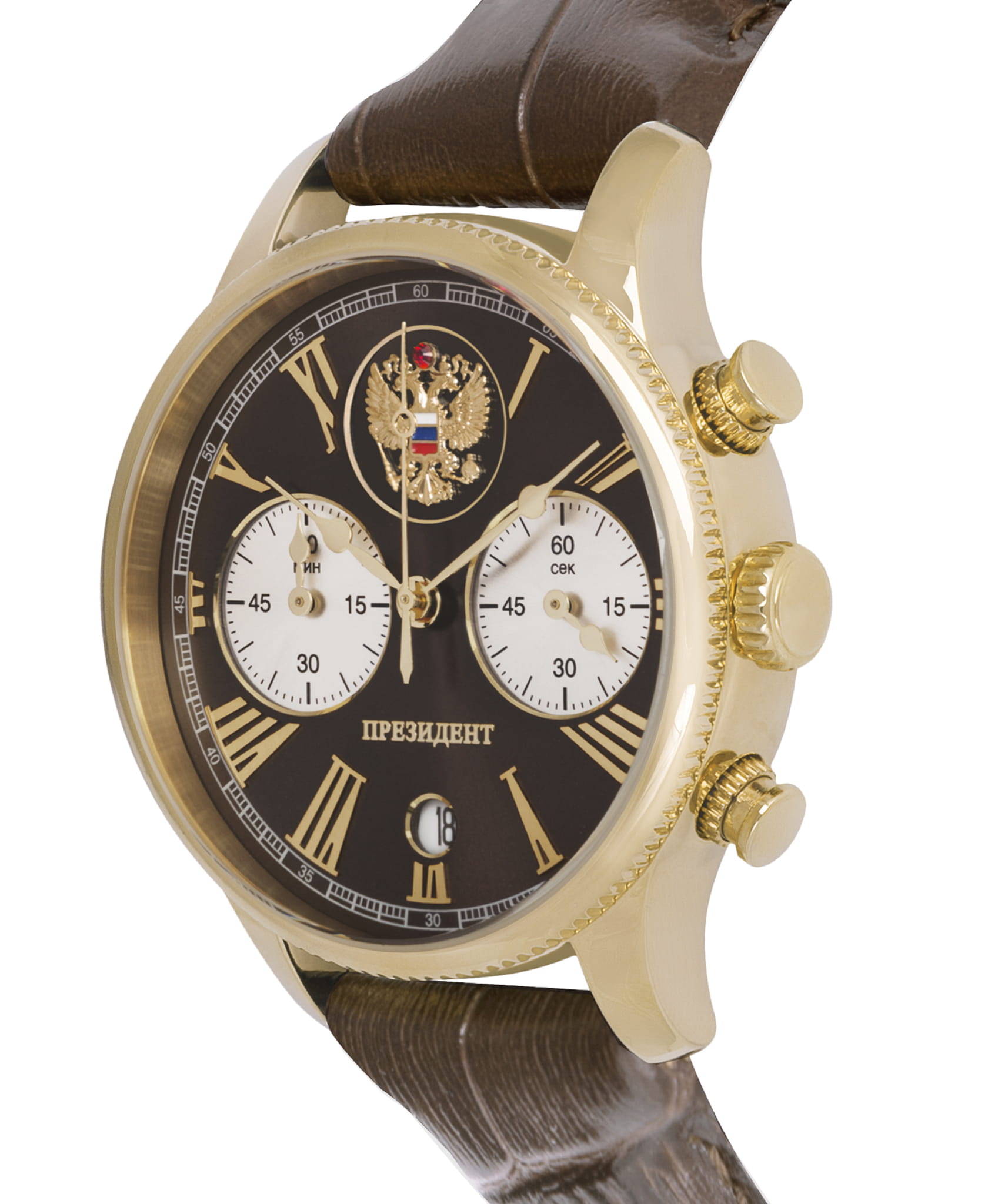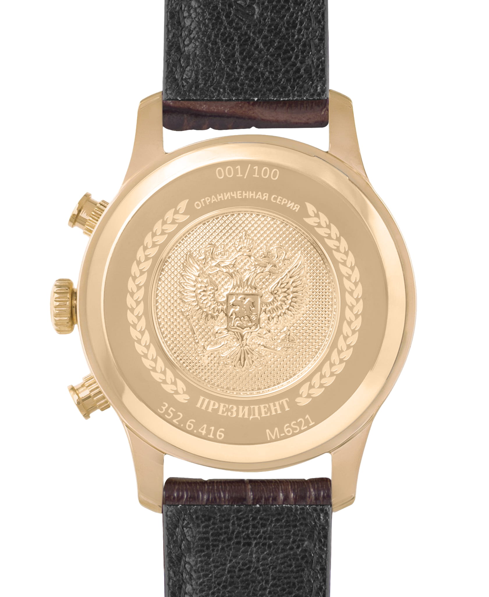 Часы «Президент» модели 3526416 — это мужские кварцевые наручные часы с хронографом, выпущенные ограниченным тиражом в 100 экземпляров. Механизм: японский кварцевый хронограф Miyota 6S21, обеспечивающий высокую точность. Функции: часы, минуты, секунды, дата, хронограф (секундомер). Корпус: из нержавеющей стали с PVD-покрытиемPVDУльтратонкое покрытие наносится в технике вакуумного напыления, сочетает в себе нитрид титана особой прочности со слоем золота или оксида хрома. Несёт в себе декоративную или защитную функцию. цвета жёлтого золота, диаметром 41,8 мм, толщиной 11,4 мм. Циферблат: чёрный с римскими цифрами и изображением государственного герба, подчёркивающий элегантный стиль. Стекло: сапфировое стеклоСапфировое стеклоПрочный и надёжный материал из кристалла сапфира синтетического происхождения, характеризующийся особой твёрдостью и устойчивостью к царапинам и повреждениям. с антибликовым покрытием, устойчивое к царапинам. Водонепроницаемость: 5 ATM (50 метров), что делает часы подходящими для повседневного использования. Ремешок: из натуральной кожи коричневого цвета, шириной 20 мм, с классической застёжкой. Эти часы — идеальный выбор для ценителей стиля и ограниченных коллекций.