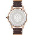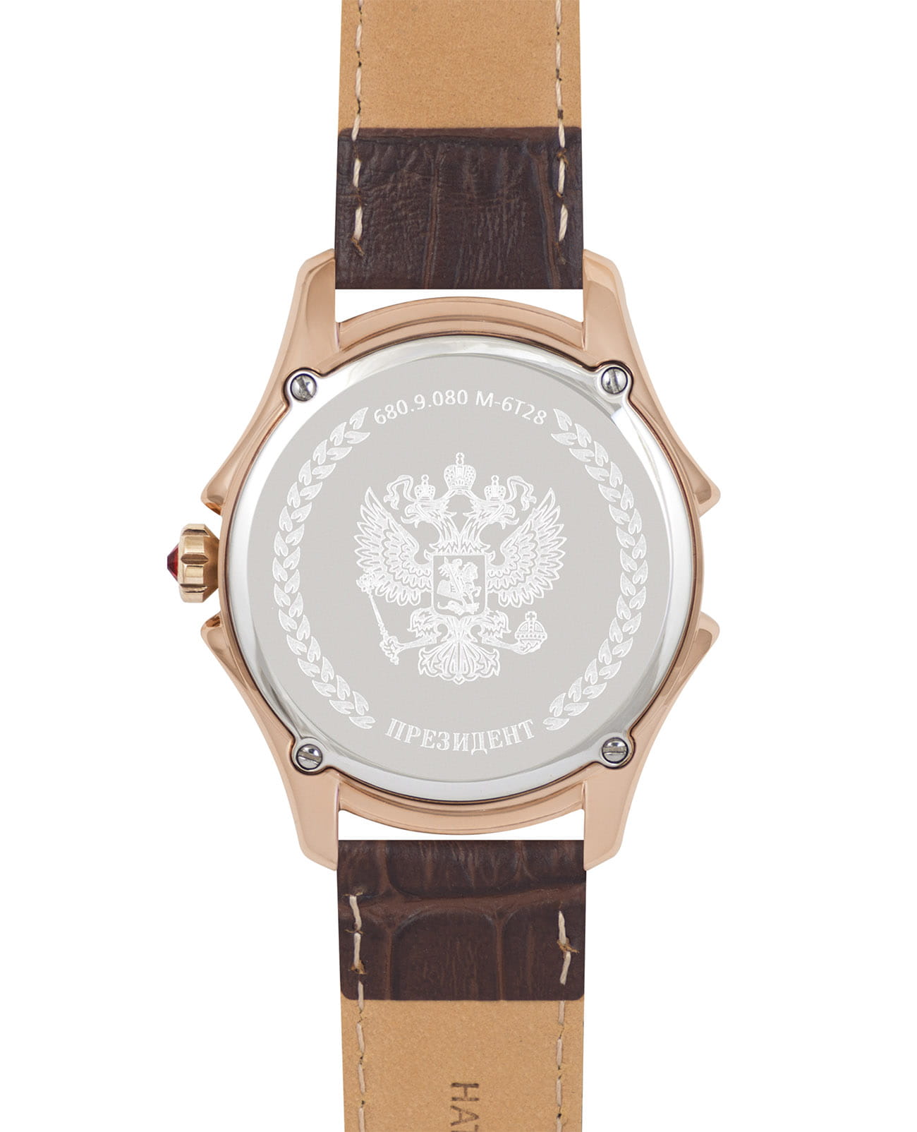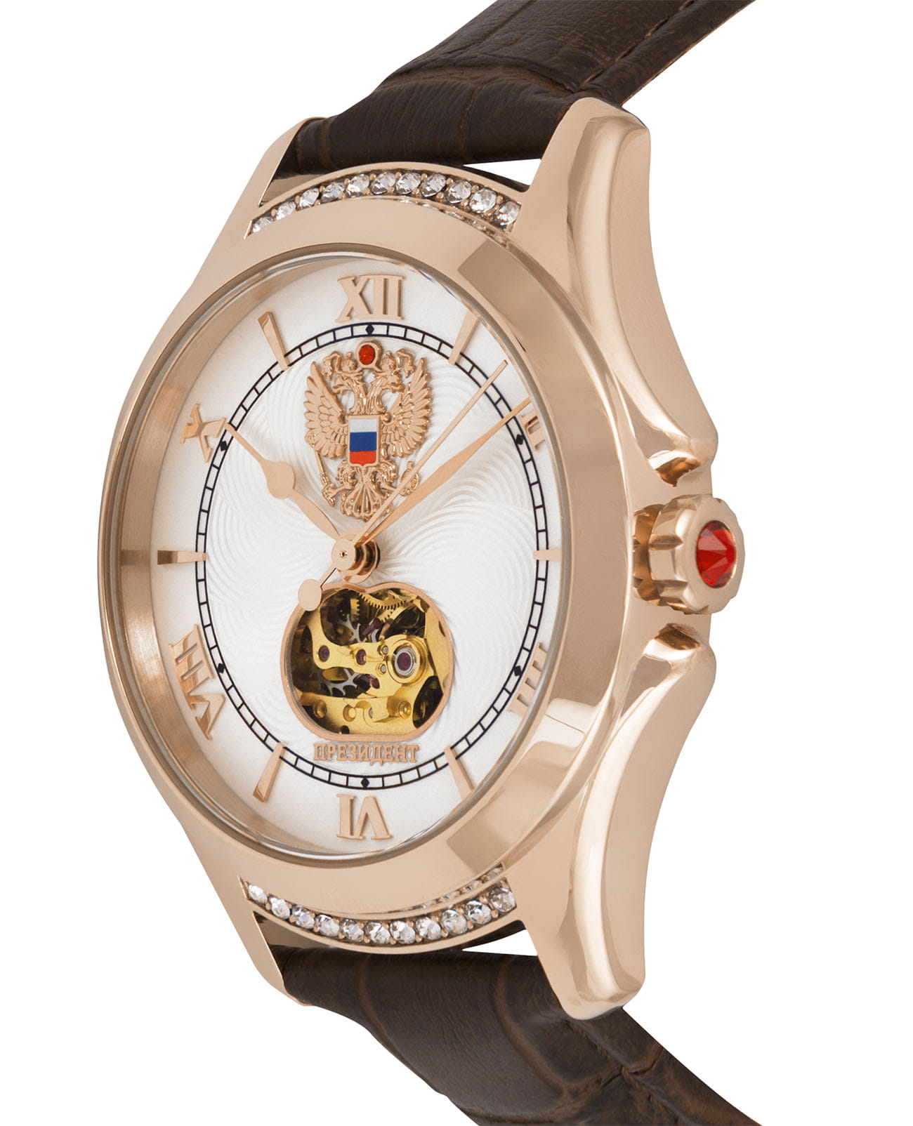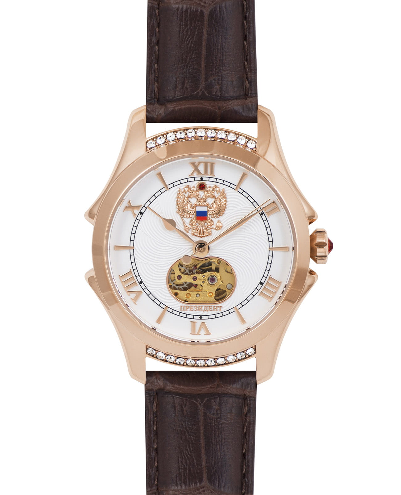 Стильные элегантные часы «Президент» — это идеальное дополнение к образу уверенной и целеустремлённой женщины. Модель выполнена в круглой форме с корпусом диаметром 39 мм и толщиной 11 мм, украшенным розовым золотом18-каратное золотоОбозначение по каратной системе пробирования, оно показывает, сколько драгоценного металла содержится в изделии. 18 карат - в составе 75% чистого золота, соответствует 750 пробе.