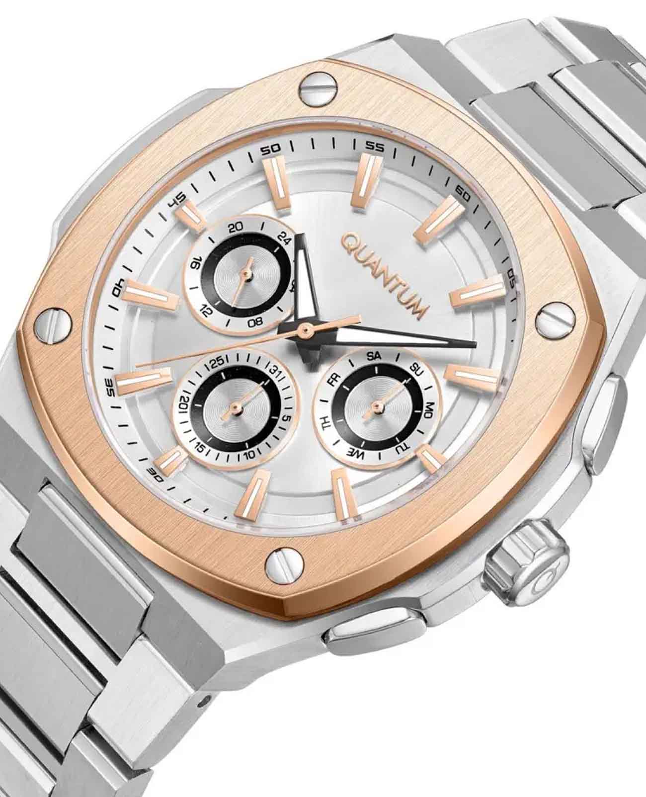 Мужские часы Quantum ADG1032.530, кварцевый механизм с высокой точностью. Класс водозащиты: 100 метров, позволит плавать, нырять и заниматься другими водными видами спорта. Корпус и браслет часов изготовлены из стали. Стальной браслет на раскладной застёжкеРаскладная застёжкаТакой тип застёжки используется только на браслетах из металла. Она никогда не раскрывается полностью, происходит разделение на 2 и более частей. Раскладывающая застёжка снизит вероятность потери часов к минимуму.. Стрелки с люминесцентным покрытиемЛюминесцентное покрытиеПозволяет считывать показания времени в темноте. Производители наносят на стрелки, часовые индексы, безель или поверхность циферблата светонакопительный состав, дающий холодное свечение.. На малых циферблатах отображается день недели и текущее время в 24-х часовом формате. БезельБезельВнешний ободок, закрепляющий стекло. В спортивных часах так называется поворотное кольцо с делениями на циферблате, выполняет роль таймера – замеряет отрезки времени на шкале. Неподвижный безель – элемент декора. Однонаправленно вращающийся безель на дайверских часах позволяет фиксировать моменты погружения и выныривания на поверхность. с IP-покрытиемIP-покрытиеМетод ионного напыления. Демонстрирует повышенную устойчивость к истиранию, окислению и химическим веществам. Под воздействием высокого давления и температуры около 1500°C молекулы металла надёжно соединяются с частицами корпуса часов..