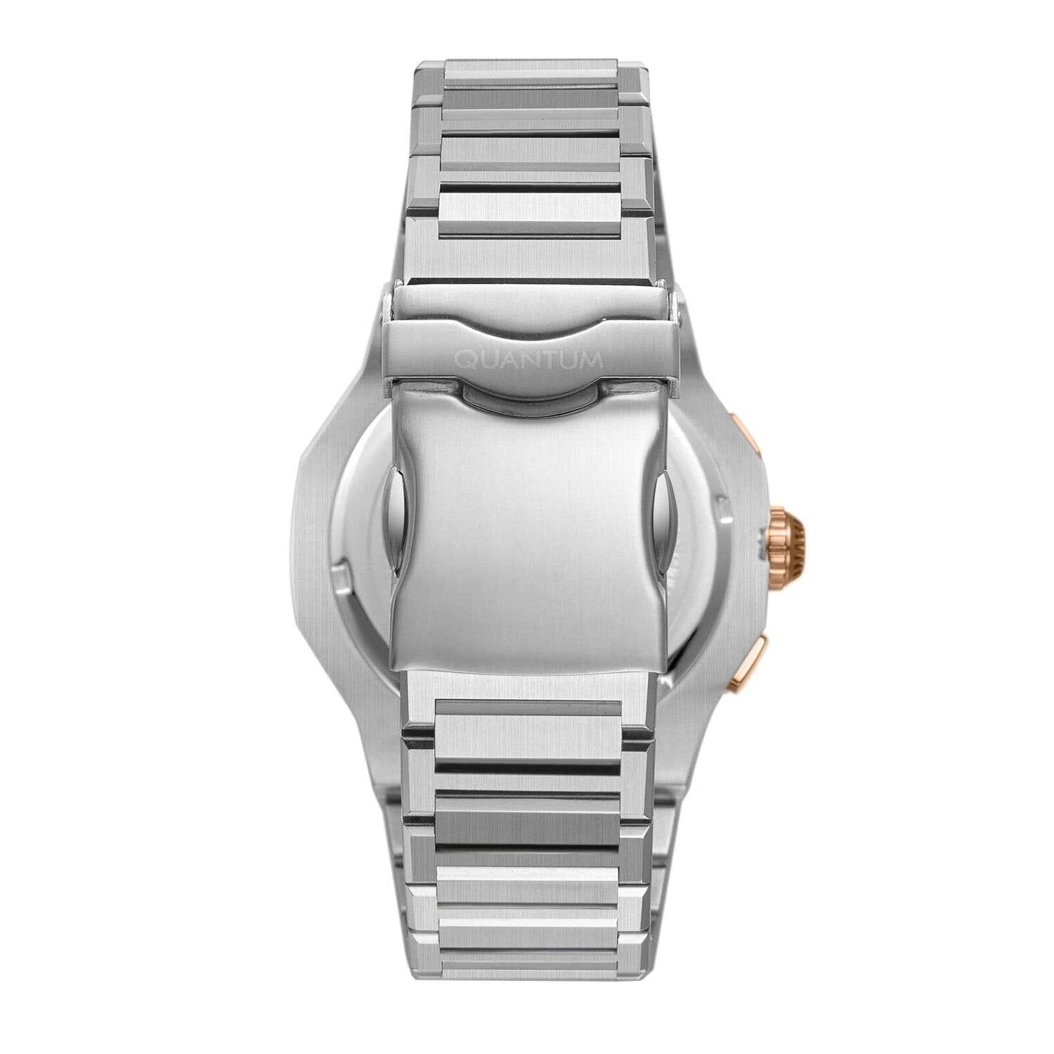 Мужские кварцевые часы Quantum HNG1081.530 из коллекции Hunter — функциональный хронограф в классическом круглом корпусе размером 46 мм из нержавеющей стали. БезельБезельВнешний ободок, закрепляющий стекло. В спортивных часах так называется поворотное кольцо с делениями на циферблате, выполняет роль таймера – замеряет отрезки времени на шкале. Неподвижный безель – элемент декора. Однонаправленно вращающийся безель на дайверских часах позволяет фиксировать моменты погружения и выныривания на поверхность. с PVD-покрытиемPVDУльтратонкое покрытие наносится в технике вакуумного напыления, сочетает в себе нитрид титана особой прочности со слоем золота или оксида хрома. Несёт в себе декоративную или защитную функцию.. Циферблат оснащён окошком даты, 24-часовым форматом времени на малом циферблате и функцией хронографаХронографФункция позволяет измерять отрезки времени с особой точностью: часы, минуты, секунды. Верным признаком хронографа является наличие на циферблате 3 дополнительных окошек-счётчиков. с секундомером. Стекло — минеральноеМинеральное стеклоМинеральное стекло представляет собой искусственно выращенный минерал кварца. Такое стекло отличается особой устойчивостью к повреждениям и царапинам. Уступает по некоторым качествам сапфировому стеклу. с антибликовым покрытием. Стрелки с люминесцентным покрытиемЛюминесцентное покрытиеПозволяет считывать показания времени в темноте. Производители наносят на стрелки, часовые индексы, безель или поверхность циферблата светонакопительный состав, дающий холодное свечение.. Водонепроницаемость 100 м. Браслет — стальной на раскладной застёжкеРаскладная застёжкаТакой тип застёжки используется только на браслетах из металла. Она никогда не раскрывается полностью, происходит разделение на 2 и более частей. Раскладывающая застёжка снизит вероятность потери часов к минимуму.. Идеальный выбор для тех, кто ценит турецкий дизайн и повседневную практичность.