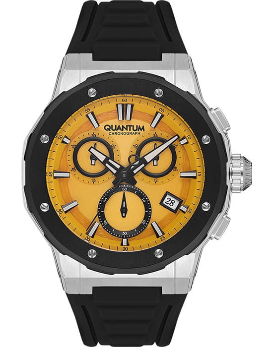 Мужские наручные часы-хронографХронографФункция позволяет измерять отрезки времени с особой точностью: часы, минуты, секунды. Верным признаком хронографа является наличие на циферблате 3 дополнительных окошек-счётчиков. Quantum HNG1082.311, кварцевый механизм с высокой точностью. Минеральное стеклоМинеральное стеклоМинеральное стекло представляет собой искусственно выращенный минерал кварца. Такое стекло отличается особой устойчивостью к повреждениям и царапинам. Уступает по некоторым качествам сапфировому стеклу. устойчивое к появлению царапин, обладающее высокой прозрачностью. Класс водозащиты: 100 метров, позволит плавать, нырять и заниматься другими водными видами спорта. Корпус часов изготовлен из нержавеющей стали. Стрелки и метки с люминесцентным покрытиемЛюминесцентное покрытиеПозволяет считывать показания времени в темноте. Производители наносят на стрелки, часовые индексы, безель или поверхность циферблата светонакопительный состав, дающий холодное свечение.. Каучуковый ремешок.