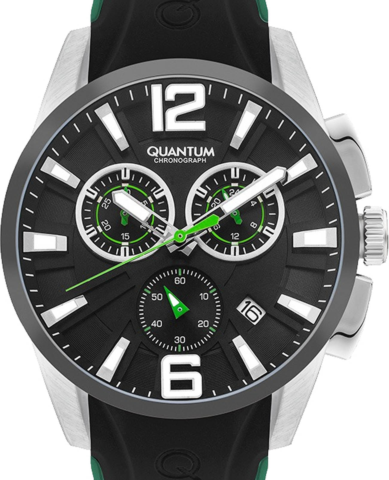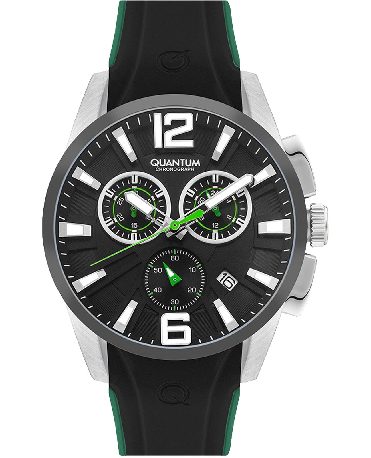 Мужские наручные часы-хронографХронографФункция позволяет измерять отрезки времени с особой точностью: часы, минуты, секунды. Верным признаком хронографа является наличие на циферблате 3 дополнительных окошек-счётчиков. Quantum PWG1076.351, кварцевый механизм с высокой точностью. Минеральное стеклоМинеральное стеклоМинеральное стекло представляет собой искусственно выращенный минерал кварца. Такое стекло отличается особой устойчивостью к повреждениям и царапинам. Уступает по некоторым качествам сапфировому стеклу. устойчивое к появлению царапин, обладающее высокой прозрачностью. Класс водозащиты: 100 метров, позволит плавать, нырять и заниматься другими водными видами спорта. Корпус часов изготовлен из нержавеющей стали. Стрелки и метки с люминесцентным покрытиемЛюминесцентное покрытиеПозволяет считывать показания времени в темноте. Производители наносят на стрелки, часовые индексы, безель или поверхность циферблата светонакопительный состав, дающий холодное свечение..Браслет из каучука на стандартной застежке.