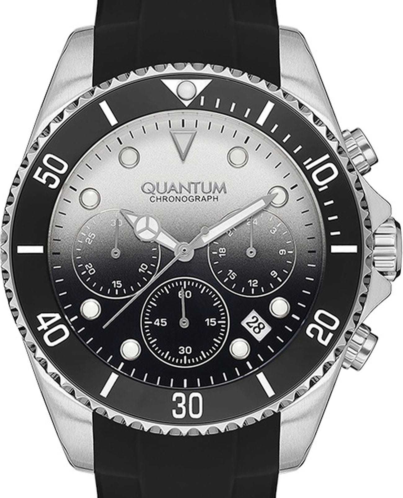 Мужские наручные часы Quantum PWG1099.351 хронографХронографФункция позволяет измерять отрезки времени с особой точностью: часы, минуты, секунды. Верным признаком хронографа является наличие на циферблате 3 дополнительных окошек-счётчиков., кварцевый механизм с высокой точностью. Минеральное стеклоМинеральное стеклоМинеральное стекло представляет собой искусственно выращенный минерал кварца. Такое стекло отличается особой устойчивостью к повреждениям и царапинам. Уступает по некоторым качествам сапфировому стеклу. устойчивое к появлению царапин, обладающее высокой прозрачностью. Класс водозащиты: 100 метров, позволит плавать, нырять и заниматься другими водными видами спорта. Корпус часов изготовлен из нержавеющей стали. Стрелки и метки с люминесцентным покрытиемЛюминесцентное покрытиеПозволяет считывать показания времени в темноте. Производители наносят на стрелки, часовые индексы, безель или поверхность циферблата светонакопительный состав, дающий холодное свечение..Браслет из каучука на стандартной застежке. БезельБезельВнешний ободок, закрепляющий стекло. В спортивных часах так называется поворотное кольцо с делениями на циферблате, выполняет роль таймера – замеряет отрезки времени на шкале. Неподвижный безель – элемент декора. Однонаправленно вращающийся безель на дайверских часах позволяет фиксировать моменты погружения и выныривания на поверхность. с PVD-покрытиемPVDУльтратонкое покрытие наносится в технике вакуумного напыления, сочетает в себе нитрид титана особой прочности со слоем золота или оксида хрома. Несёт в себе декоративную или защитную функцию..