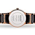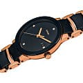 Наручные часы представляют собой воплощение классики и лаконичного дизайна, это идеальный вариант для поддержания солидного имиджа. Они выполнены из нержавеющей стали и высокотехнологичной керамикиВысокотехнологичная керамикаИнновационный запатентованный Rado материал с гладкой или матовой поверхностью. Керамика за счёт кристаллической структуры обладает повышенной устойчивостью от возникновения царапин. Материал способен принимать температуру тела человека, обеспечивая невероятный комфорт при ношении., чёрные вставки привлекательно смотрятся. Минималистичный циферблат инкрустирован 4 бриллиантами в 0,009 карат. Кварцевый калибр ETA 956.112 с высокой точностью хода. Золотистое PVD-покрытиеPVDУльтратонкое покрытие наносится в технике вакуумного напыления, сочетает в себе нитрид титана особой прочности со слоем золота или оксида хрома. Несёт в себе декоративную или защитную функцию.. Сапфировое стекло противостоит образованию царапин на поверхности. Диаметр корпуса: 28 мм.