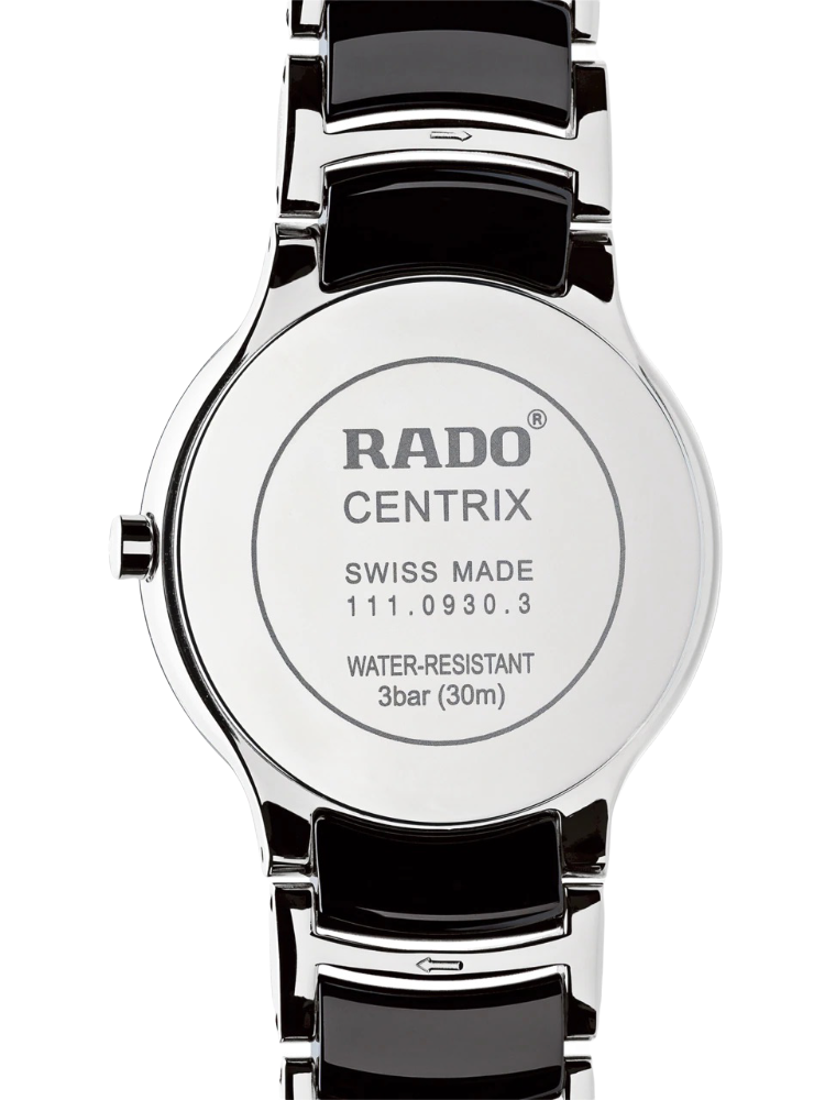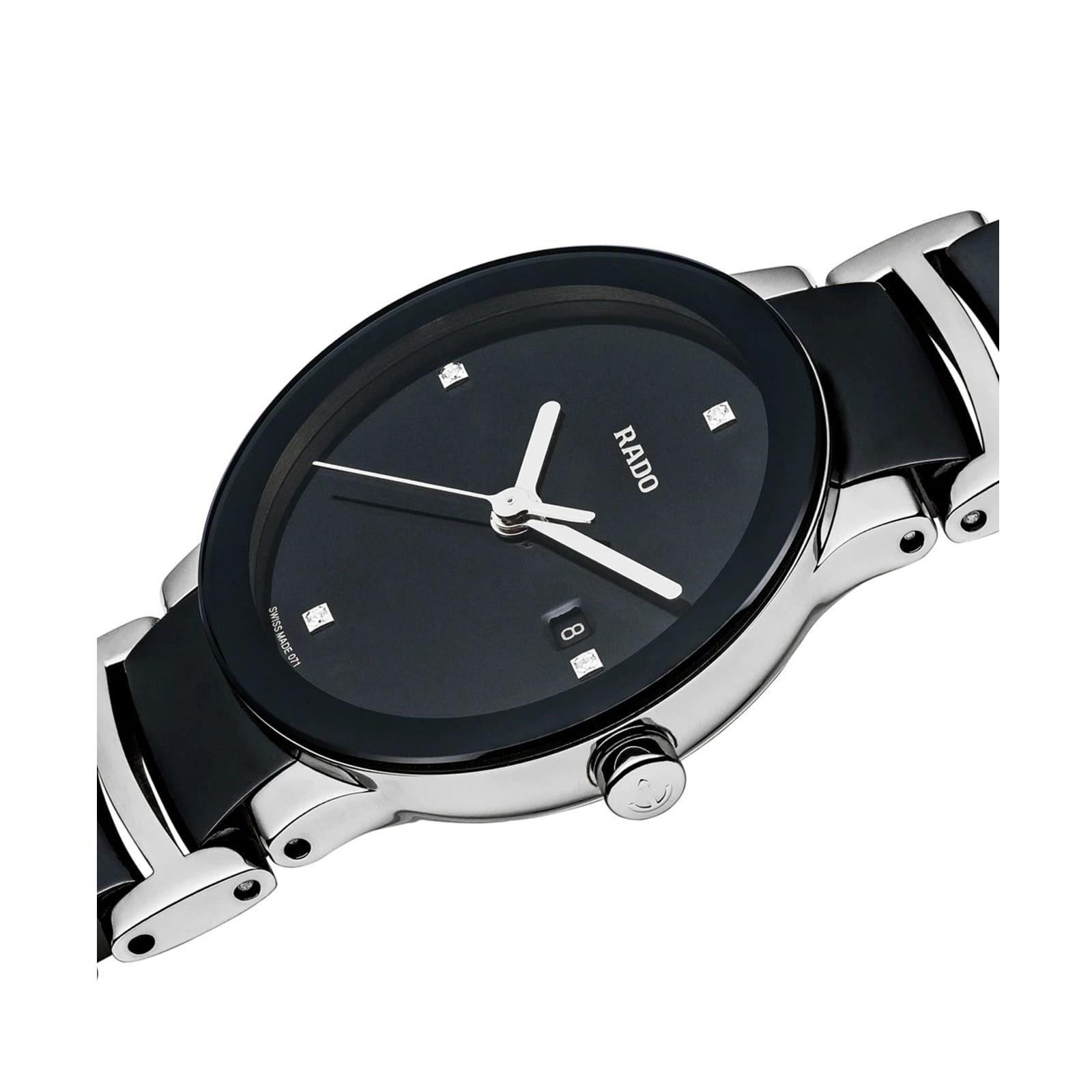 Женские швейцарские часы Rado Centrix Diamonds R30935712 из коллекции Centrix - безупречные линии и невообразимая роскошь. Наручные часы представляют собой воплощение классики и лаконичного дизайна, это идеальный вариант для поддержания солидного имиджа. Они выполнены из нержавеющей стали и высокотехнологичной керамикиВысокотехнологичная керамикаИнновационный запатентованный Rado материал с гладкой или матовой поверхностью. Керамика за счёт кристаллической структуры обладает повышенной устойчивостью от возникновения царапин. Материал способен принимать температуру тела человека, обеспечивая невероятный комфорт при ношении., чёрные вставки привлекательно смотрятся. Минималистичный циферблат инкрустирован 4 бриллиантами в 0,009 карат. Кварцевый калибр ETA 956.112 с высокой точностью хода. Сапфировое стеклоСапфировое стеклоПрочный и надёжный материал из кристалла сапфира синтетического происхождения, характеризующийся особой твёрдостью и устойчивостью к царапинам и повреждениям. противостоит образованию царапин на поверхности. Апертура даты. Диаметр корпуса: 28 мм. Производство и сборка: Швейцария.
