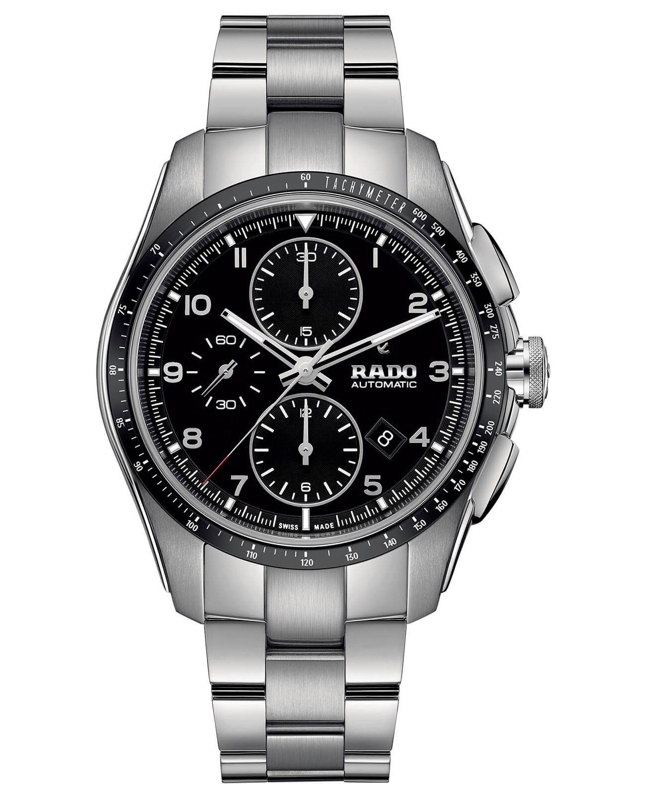 Классический хронографХронографФункция позволяет измерять отрезки времени с особой точностью: часы, минуты, секунды. Верным признаком хронографа является наличие на циферблате 3 дополнительных окошек-счётчиков. с элементами спортивного дизайна идеально подойдёт к образу солидного и делового мужчины. Серебристо-чёрная расцветка позволяет носить часы при любых обстоятельствах. Модель оснащена швейцарским автоматическим механизмом ETA A05.H21, запас хода которого увеличен до 54 часов. Прозрачная задняя крышка корпуса. Стекло из сапфира с антибликовым покрытием. Корпус и браслет из стали 316L с антикоррозионными свойствами. Чёрный безельБезельВнешний ободок, закрепляющий стекло. В спортивных часах так называется поворотное кольцо с делениями на циферблате, выполняет роль таймера – замеряет отрезки времени на шкале. Неподвижный безель – элемент декора. Однонаправленно вращающийся безель на дайверских часах позволяет фиксировать моменты погружения и выныривания на поверхность. из высокотехнологичной керамикиВысокотехнологичная керамикаИнновационный запатентованный Rado материал с гладкой или матовой поверхностью. Керамика за счёт кристаллической структуры обладает повышенной устойчивостью от возникновения царапин. Материал способен принимать температуру тела человека, обеспечивая невероятный комфорт при ношении.. Люминесцентная подсветкаЛюминесцентное покрытиеПозволяет считывать показания времени в темноте. Производители наносят на стрелки, часовые индексы, безель или поверхность циферблата светонакопительный состав, дающий холодное свечение. стрелок. Водонепроницаемость 100 метров. Секундомер, отображение даты, шкала тахиметраТахиметрРазмеченная шкала, располагается на ободке или безеле часов. Тахиметр позволяет рассчитать скорость на определённом участке пути, расстояние измеряется в километрах или милях.. . Диаметр корпуса: 44 мм.